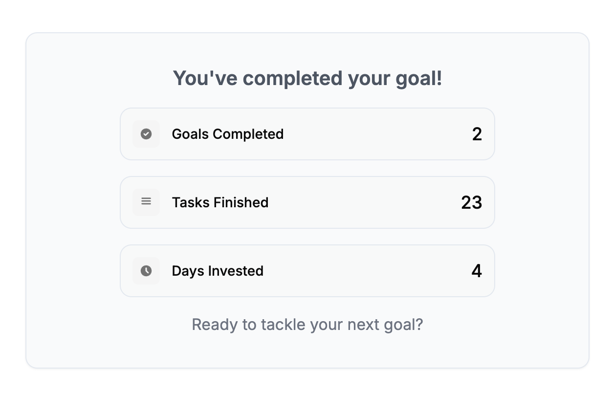 - I want to add some helpful follow-up messages for people who've finished their goals. Imagine Plantr cheering you on and suggesting your next big dream!