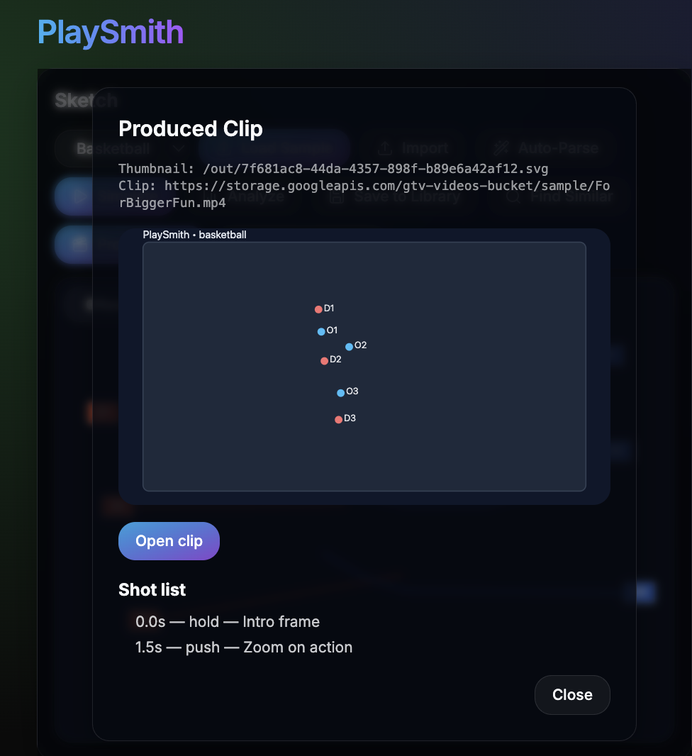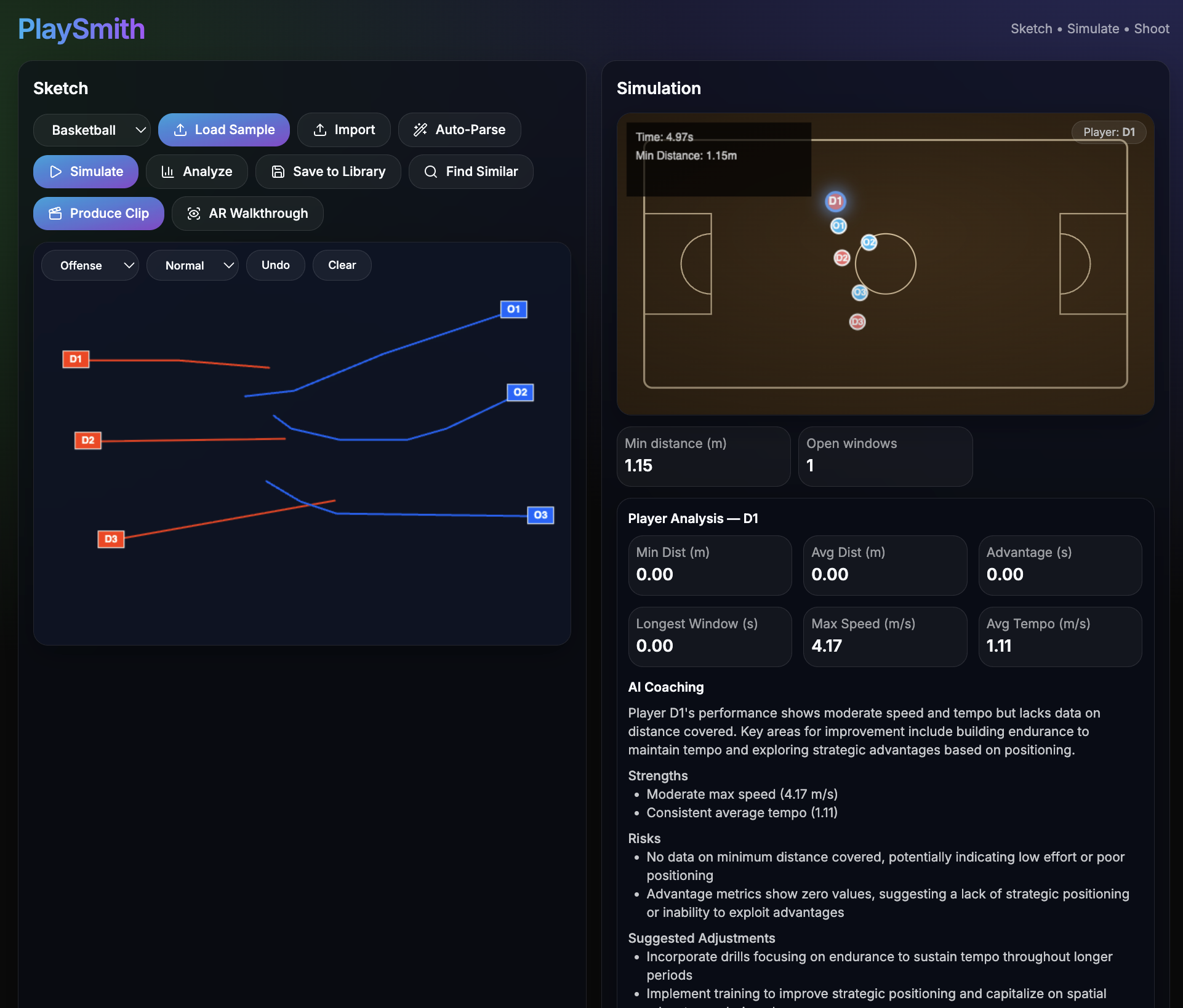 PlaySmith lets you draw a play on your phone (or scan a coach’s board), auto-parses it into structured Play JSON, and simulates vs. defense with tunable speeds and policies. It then produces a highlight clip and an AR walkthrough, and surfaces AI coaching metrics (spacing, advantage windows, drive-lane openness, tempo). You can save plays to a library and use Gemini embeddings to find similar pro sets for inspiration or scouting.