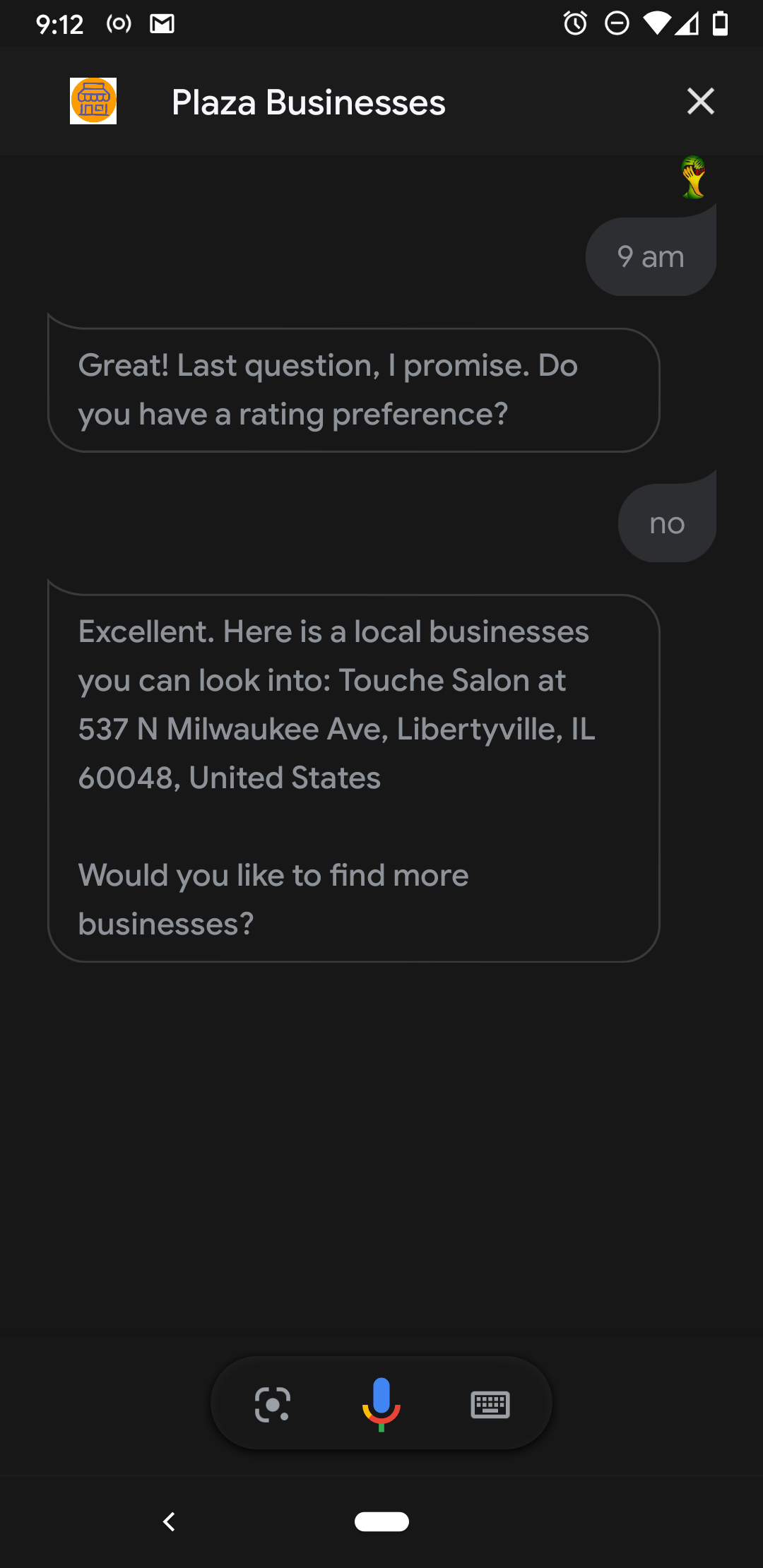 In the Chicago area, where we grew up, many local businesses have struggled due to the ongoing COVID-19 pandemic. Instead of ordering fast food, our bot gives people an easy way to discover local restaurants, salons, and other facilities. With this conversational AI we hope to combat the economic despair America is facing.