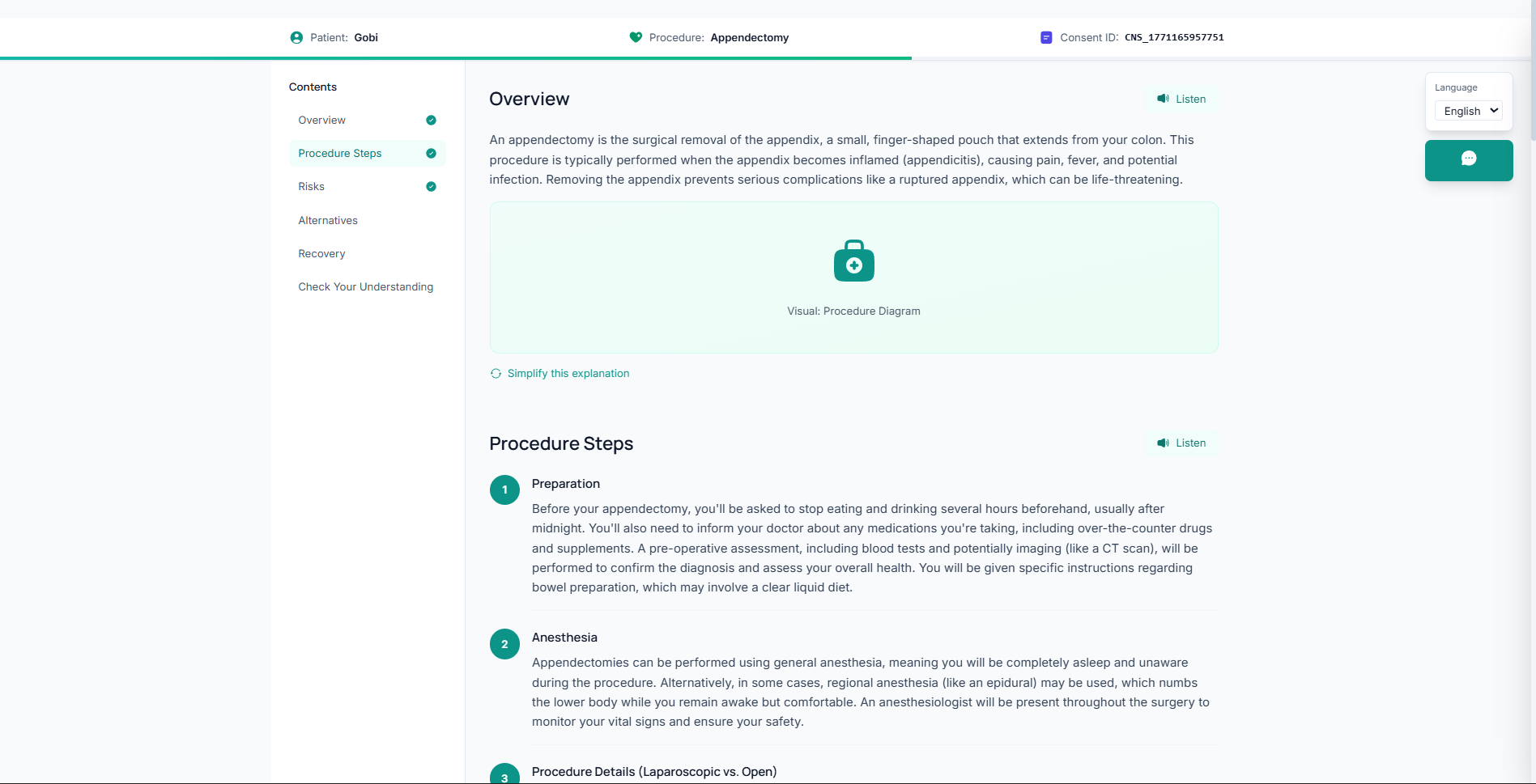 Instead of medical jargon, AI explains what the procedure is, why it's needed, the risks and benefits, and alternatives. AI assists understanding — it does not replace human responsibility.