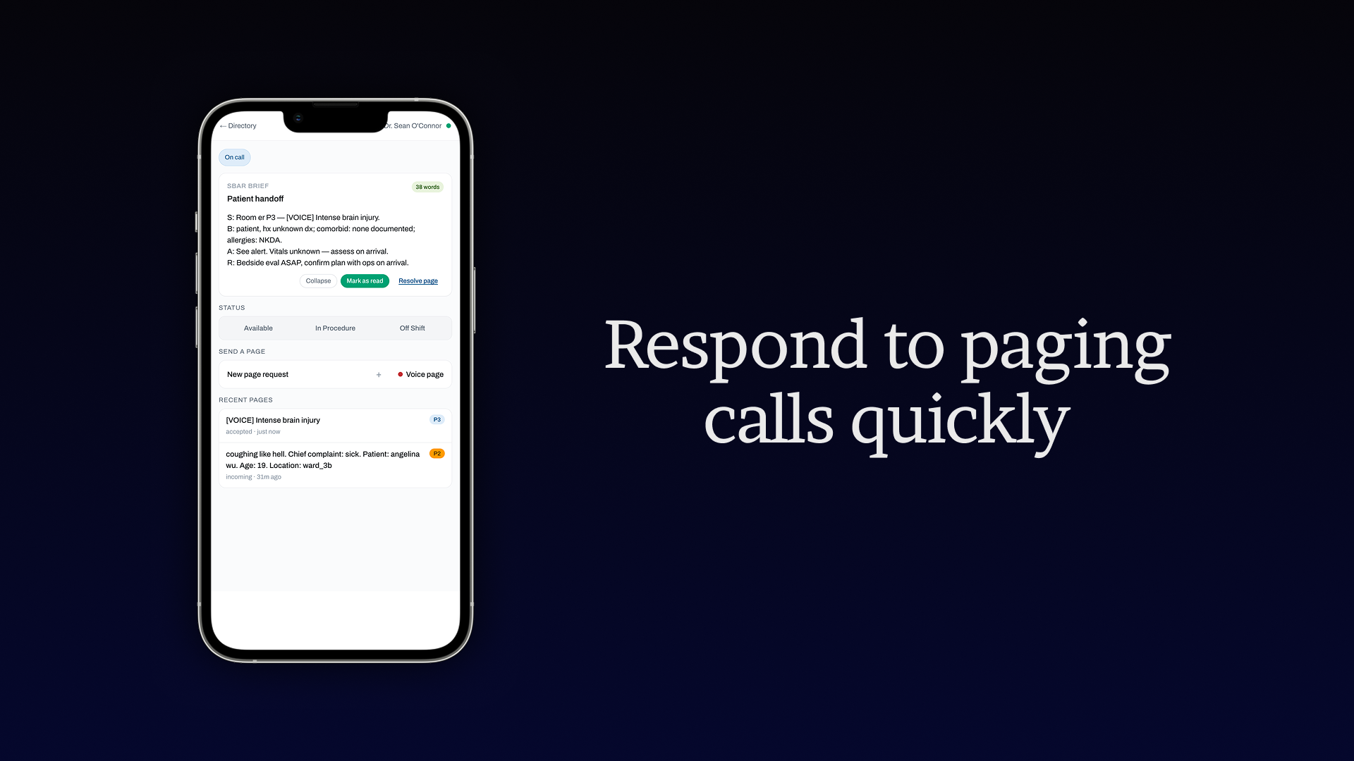 Hospital paging is still stuck in the 1990s. A nurse spots a deteriorating patient and then has to guess: Who's on call for cardiology? Are they in the OR? Is Dr. Chen closer? Has Dr. Rodriguez already been paged six times this hour? The result is a game of telephone that costs minutes — and in a code blue, minutes are lives.
