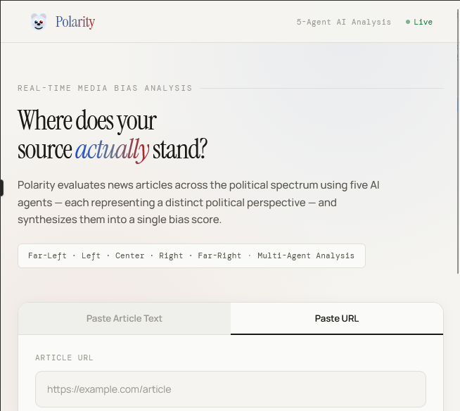 We live in a world where everyone accuses the media they disagree with of being biased but nobody has a good way to prove it. We think about trust and verification constantly. You don't just trust a system you audit it. We wanted to apply that same thinking to news. We're tired of people living in echo chambers not because they're bad people, but because they don't have the right tools. Polarity was born from a simple question: what if instead of one AI telling you whether an article is biased, you had five AI agents each with a completely different political worldview debate it?