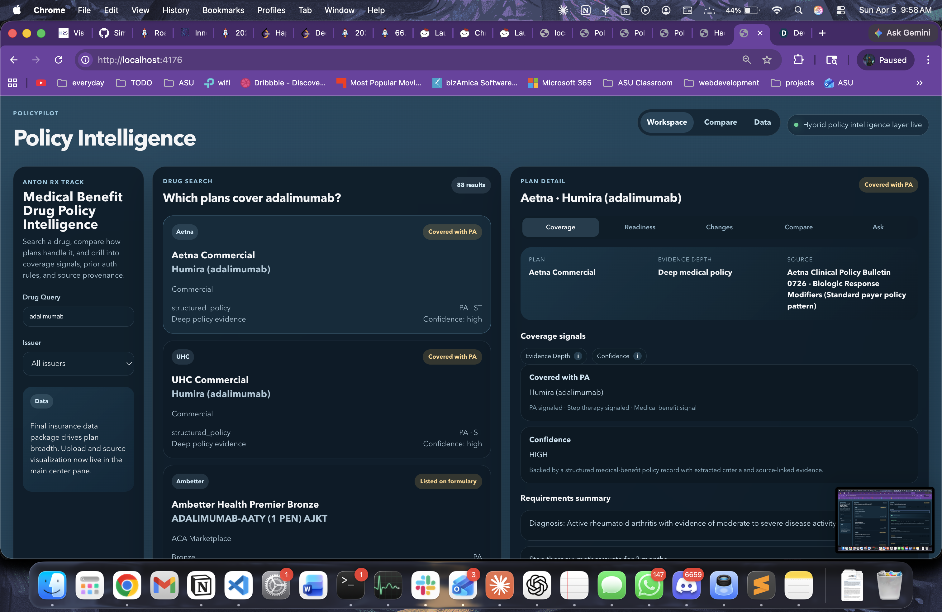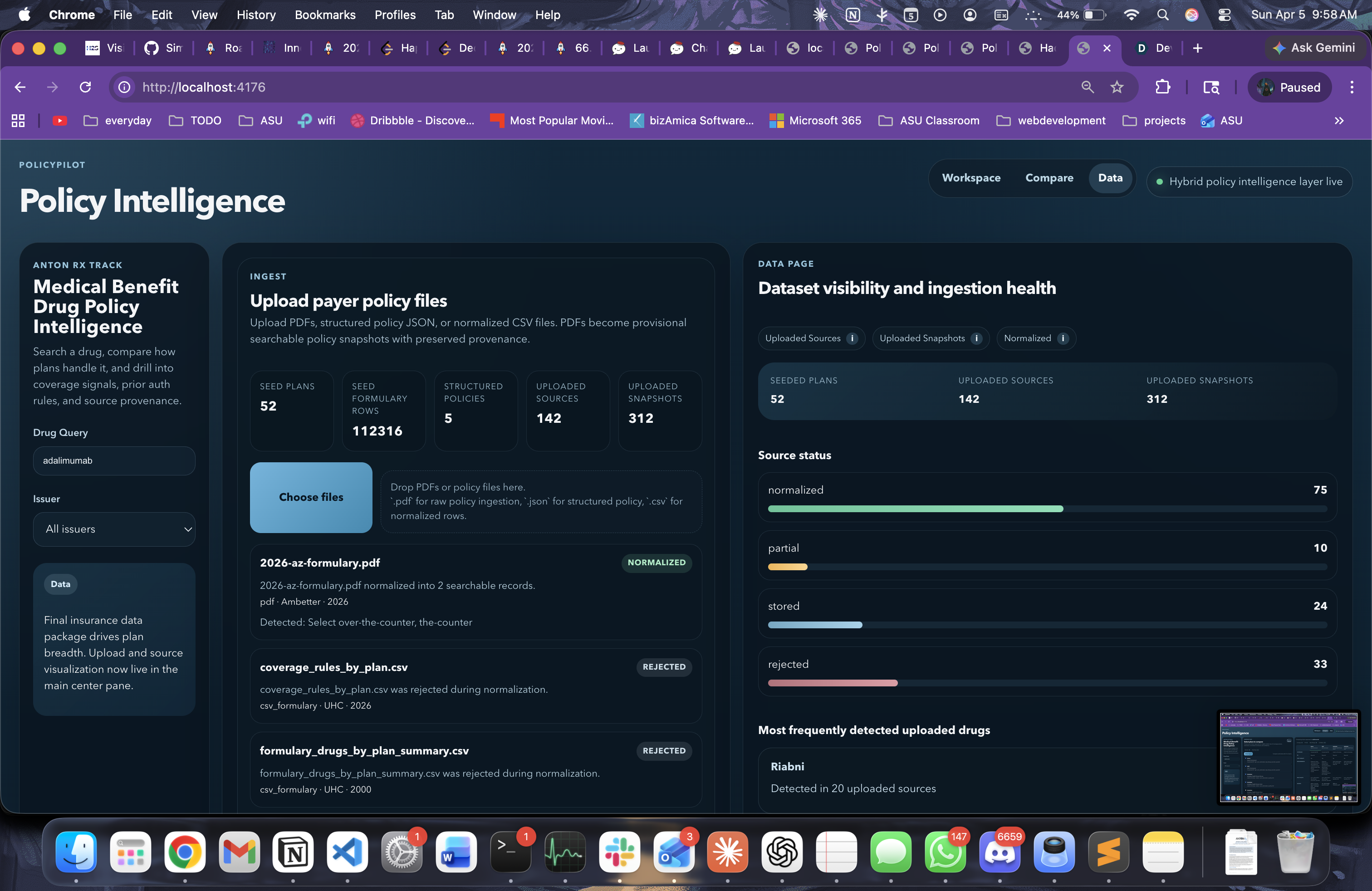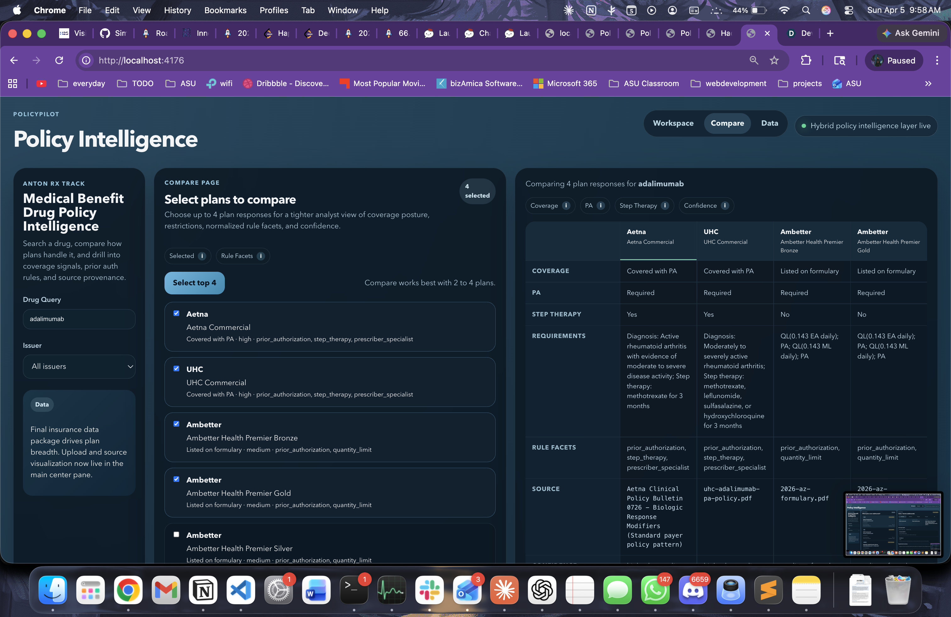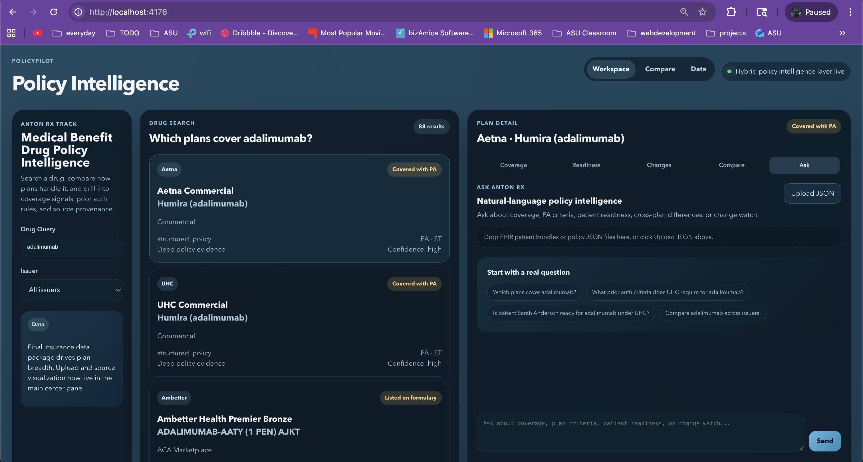 Drug coverage policy is fragmented across payer PDFs, formularies, and spreadsheets, which makes basic analysis slow and inconsistent. We built Policy Intelligence to give analysts one place to ingest, normalize, query, and compare coverage rules with confidence.