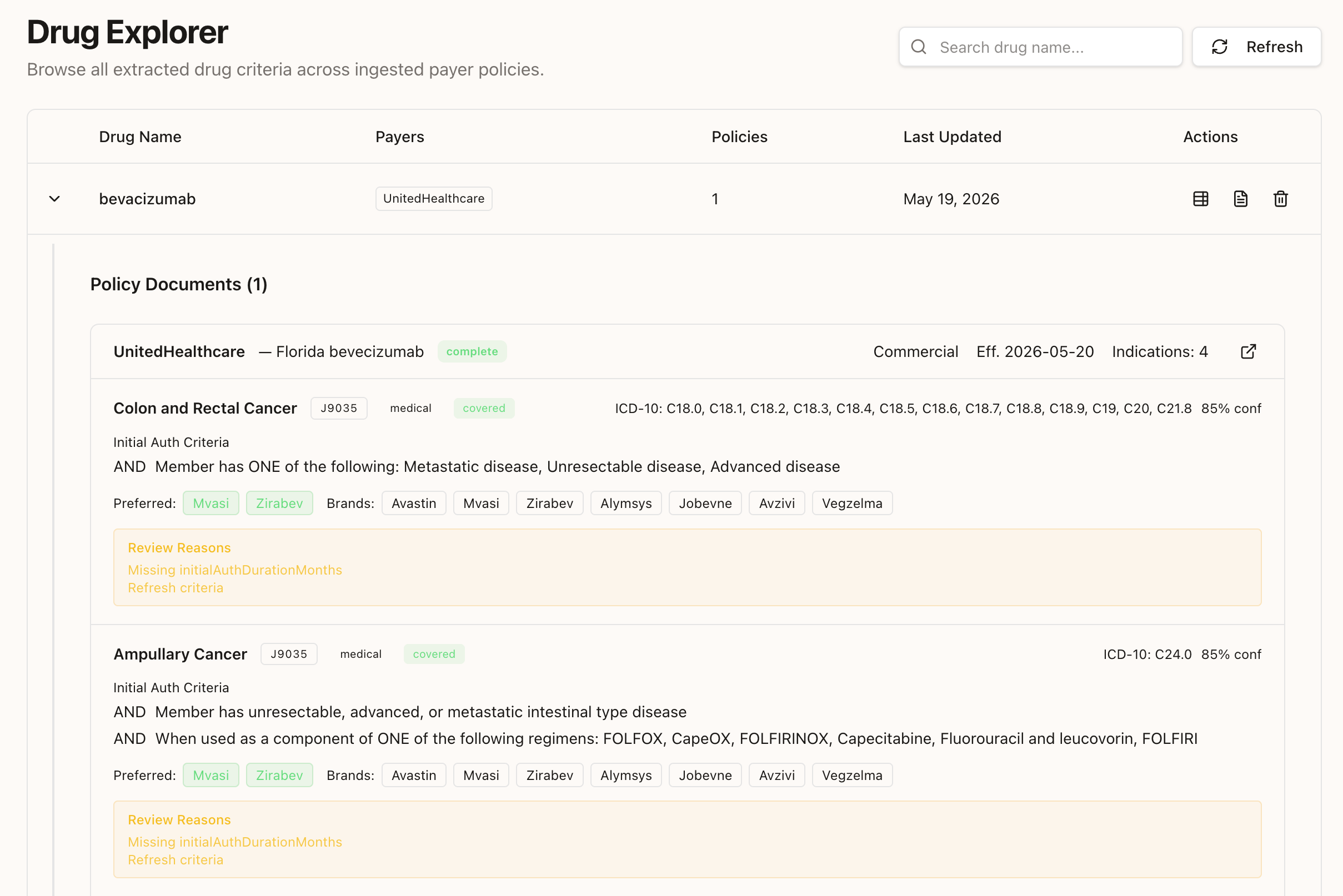 Upload a policy for something like infliximab, and the system extracts the important parts: drug and indication pairs, step therapy requirements, dosing limits, preferred product rules, prescriber restrictions, and other access criteria. Then it stores everything in a normalized format so policies from different payers can finally be compared side by side.