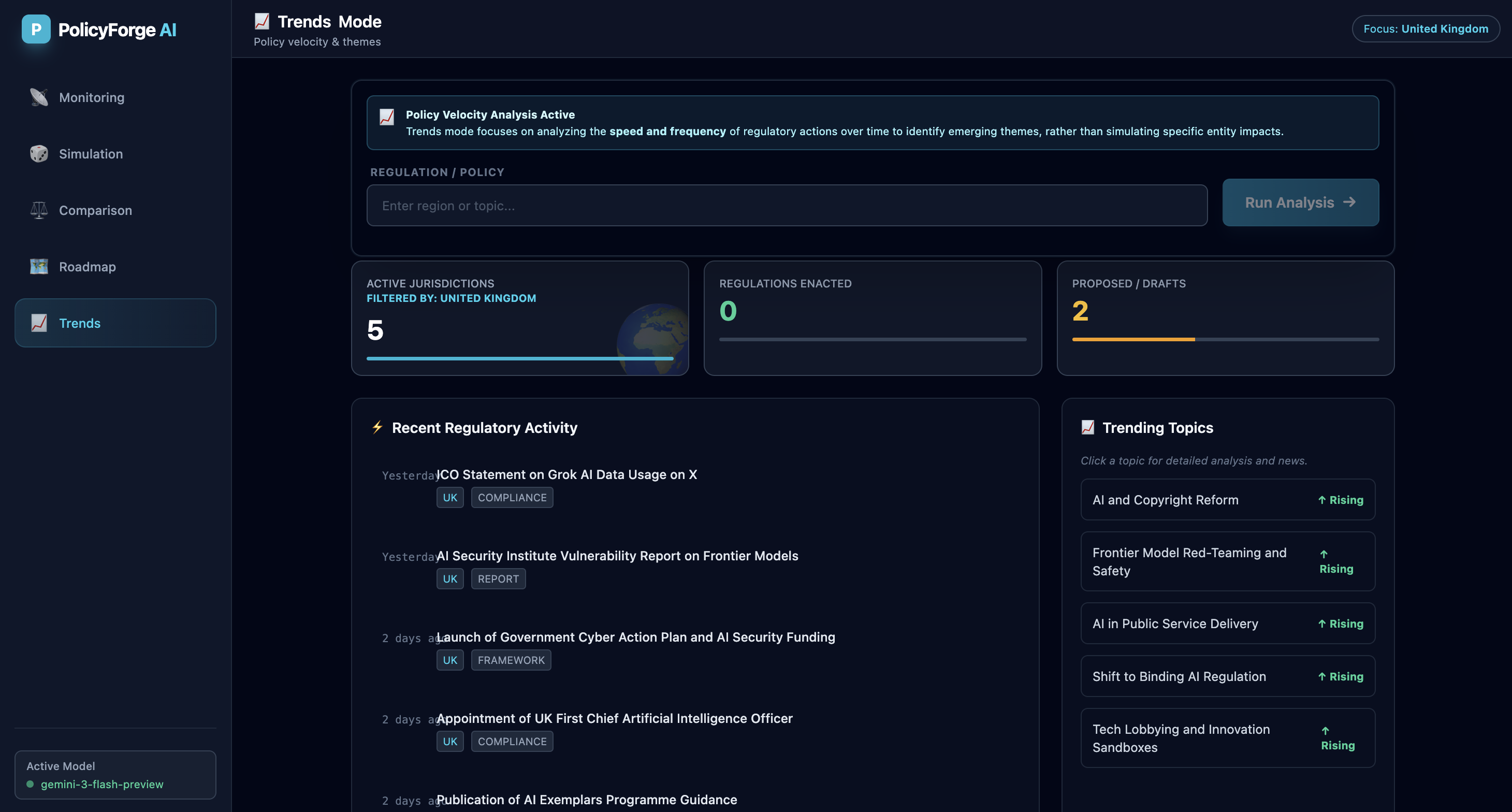 | Trends | Analyses policy velocity (speed of legislation) and identifies emerging themes with detailed explanations and news citations |