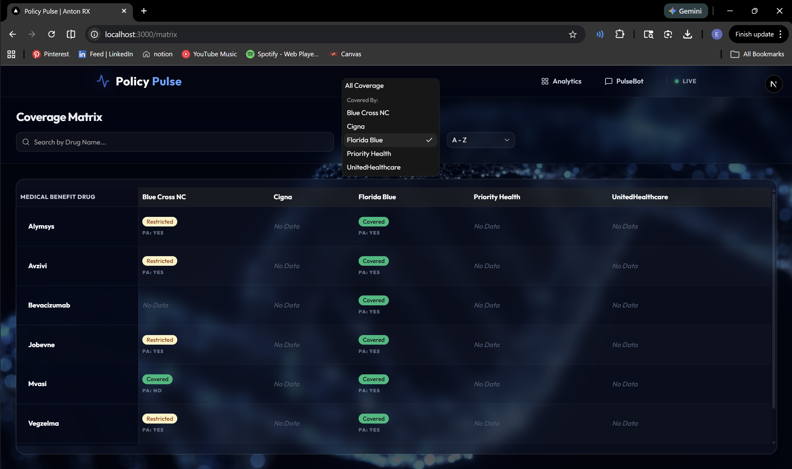 We built PolicyPulse to tackle a persistent problem in healthcare: the complexity and fragmentation of medical benefit drug coverage policies. Providers and analysts often waste hours searching through hundreds of PDF documents to determine prior authorization requirements, step therapy rules, and site-of-care restrictions. We wanted to create a single, AI-powered platform that transforms these dense policies into a searchable, interactive Coverage Matrix, enabling instant access to actionable insights.