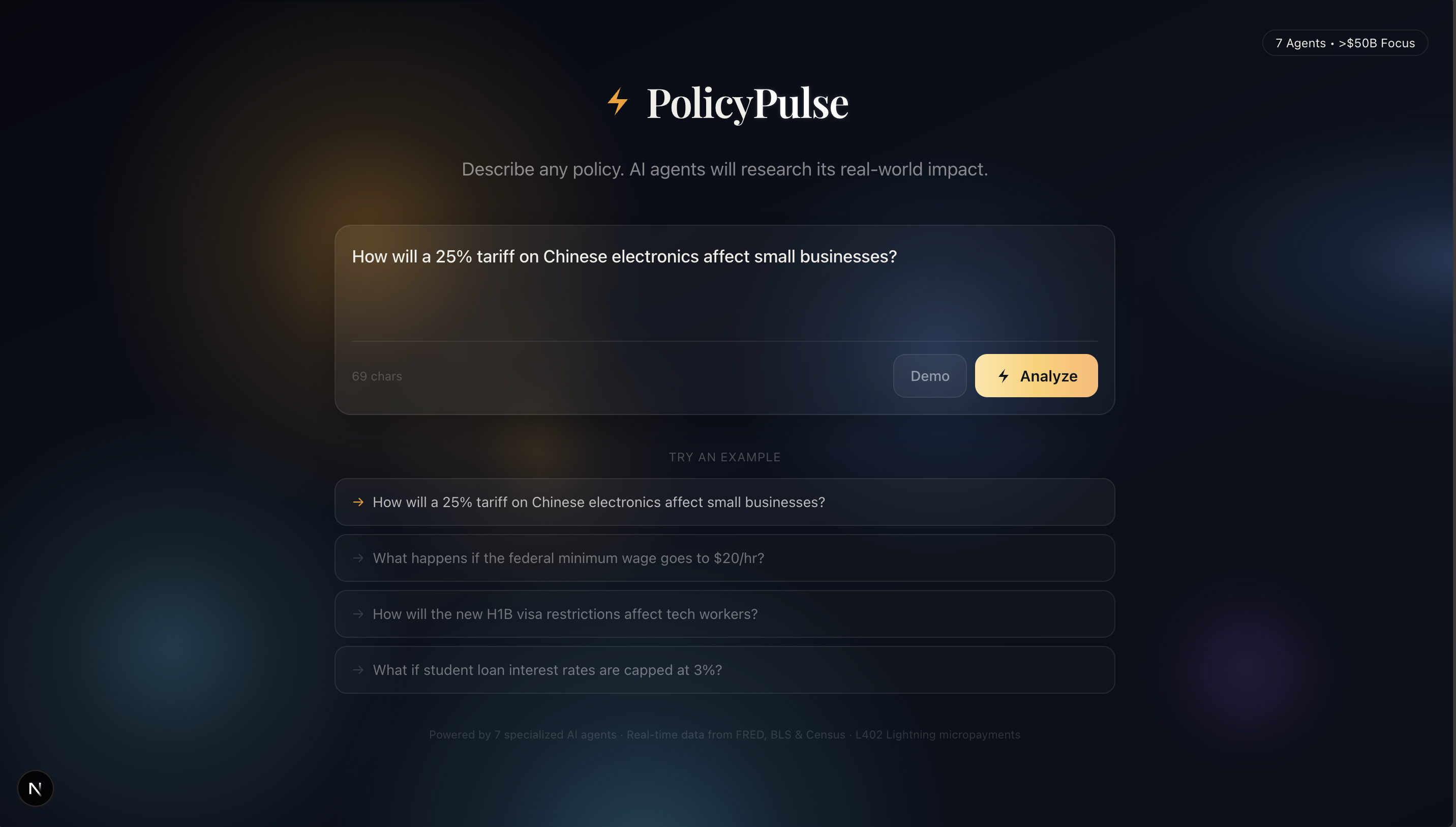 So we built PolicyPulse. Seven AI agents that pull real government data, argue with each other, and give you a clear picture of how a policy actually hits your wallet. Oh, and we also made the agents pay for premium data using Bitcoin. At a hackathon. On two hours of sleep. Because why not.