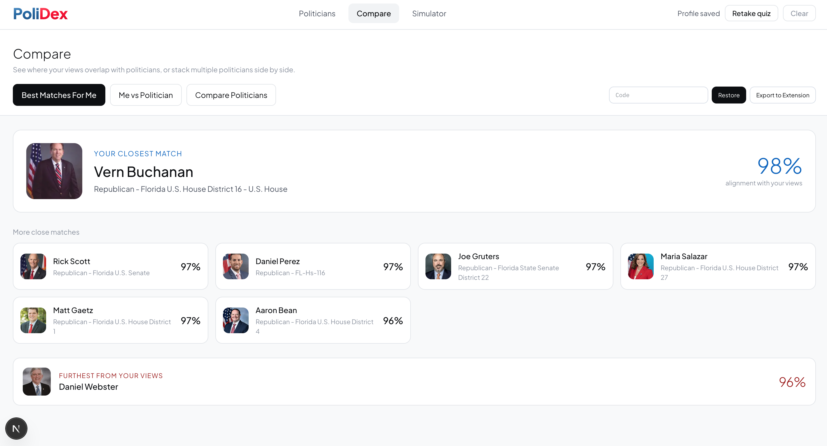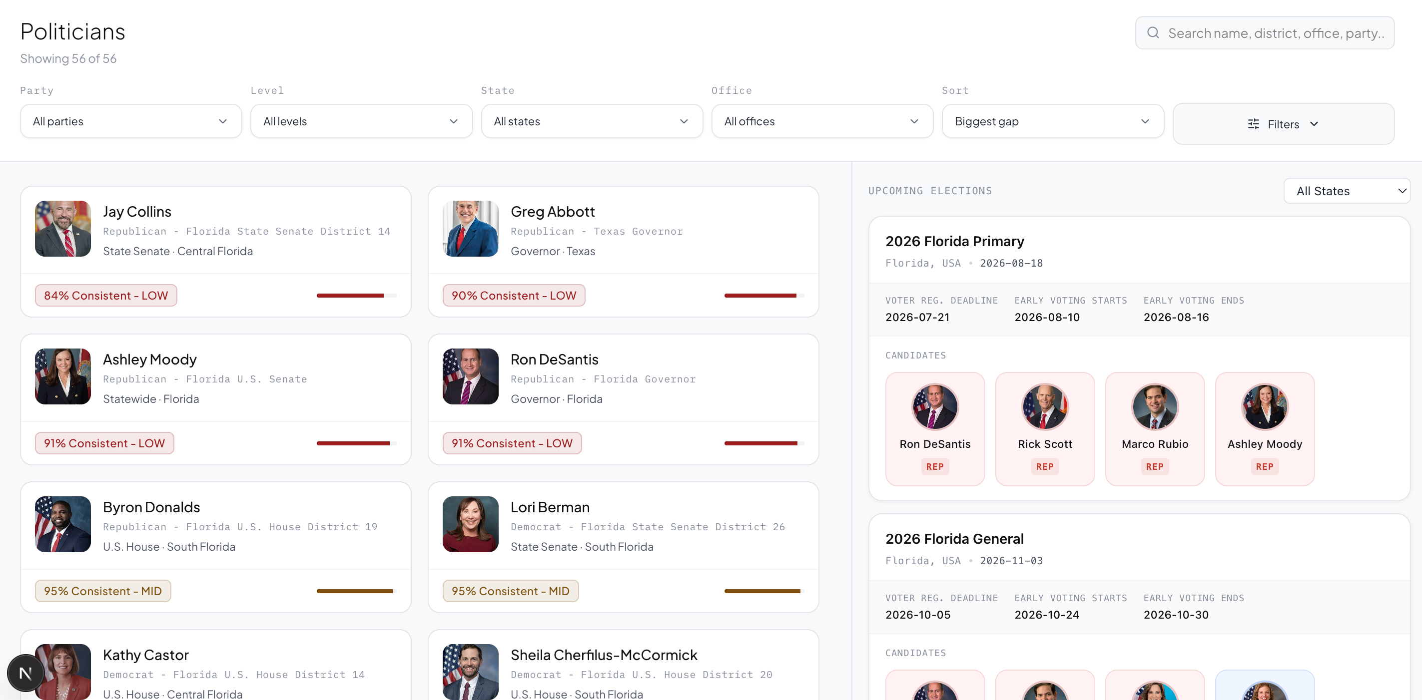 Take a quiz. Answer 20 questions about your own positions. We generate your personal policy vector and rank every politician by alignment score.