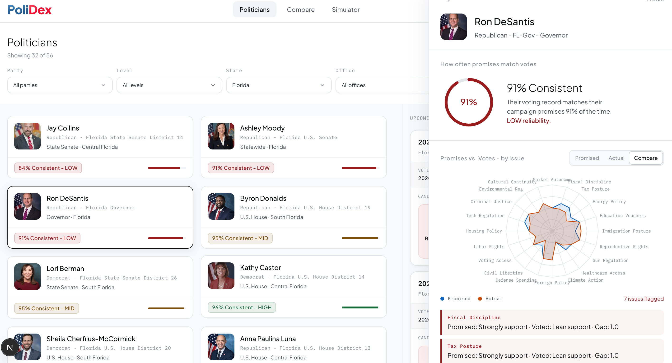 PoliDex is a political alignment engine built around a 20-dimensional policy vector space. Every politician gets a coordinate across 20 policy planks - Fiscal Policy, Civil Liberties, Energy, Healthcare, Foreign Policy, and more - scored from 1–5 based on their actual legislative record and stated positions.