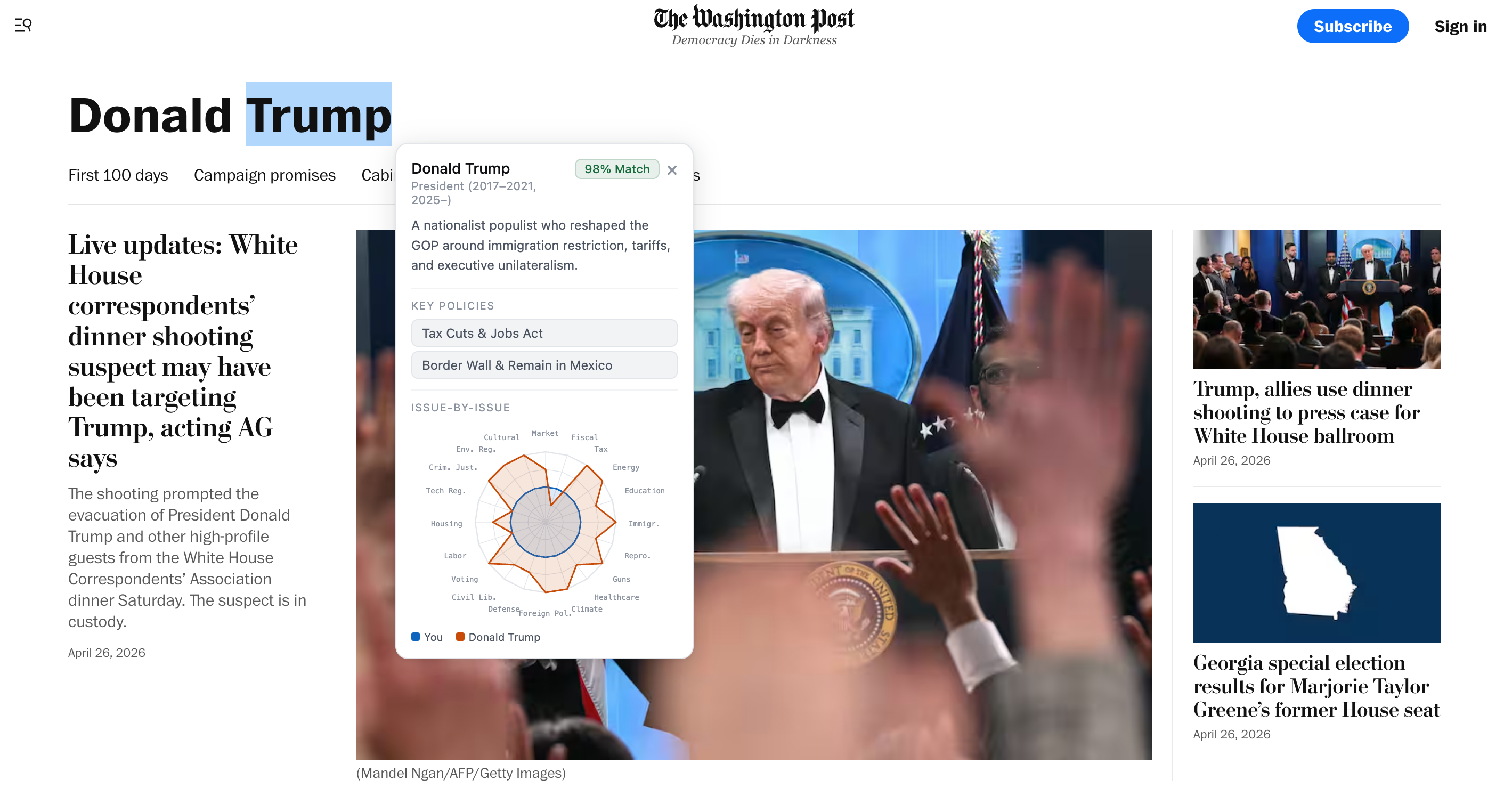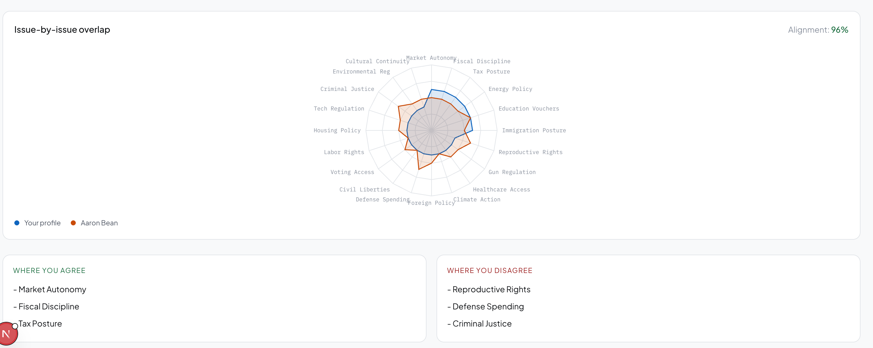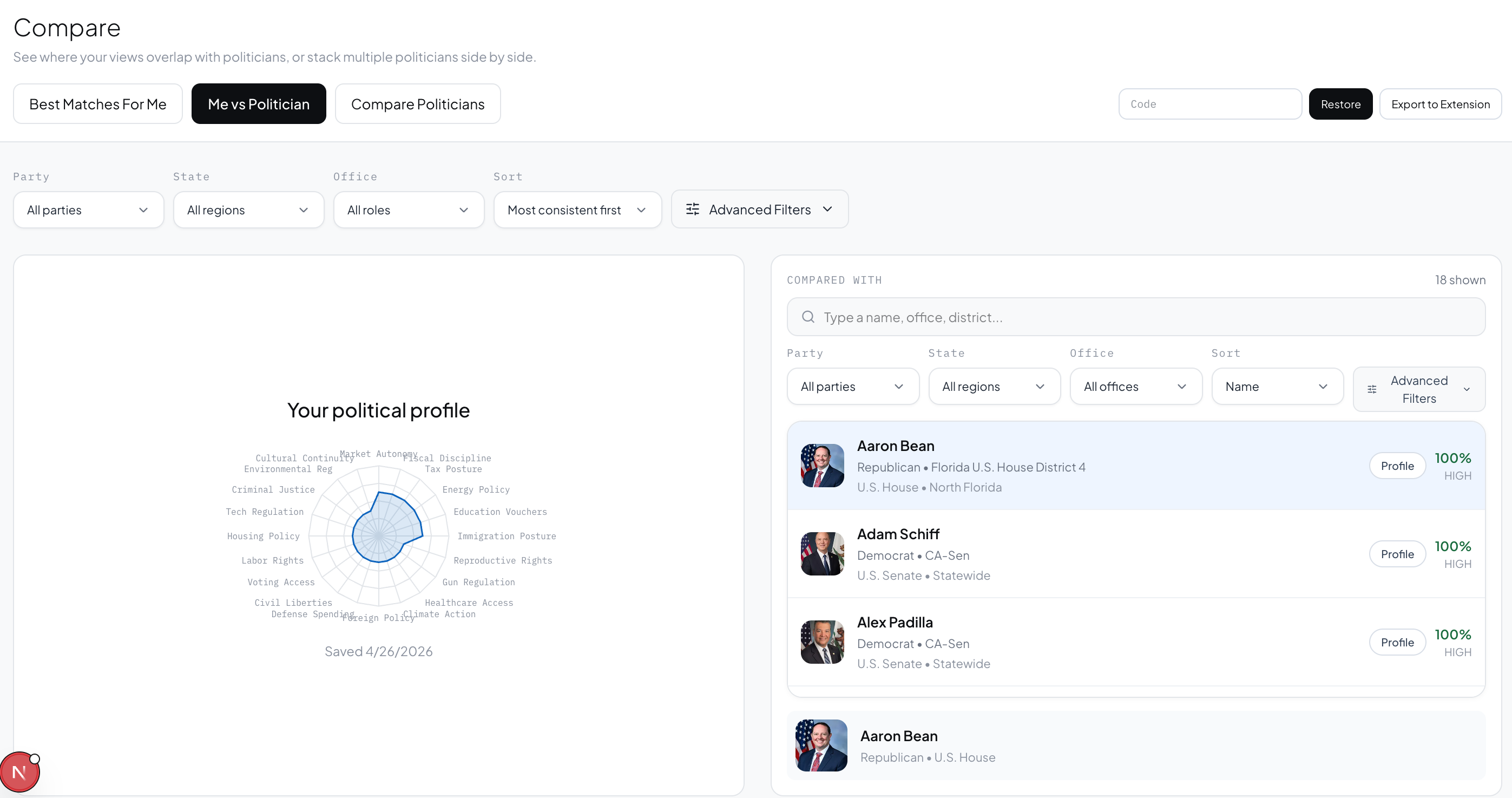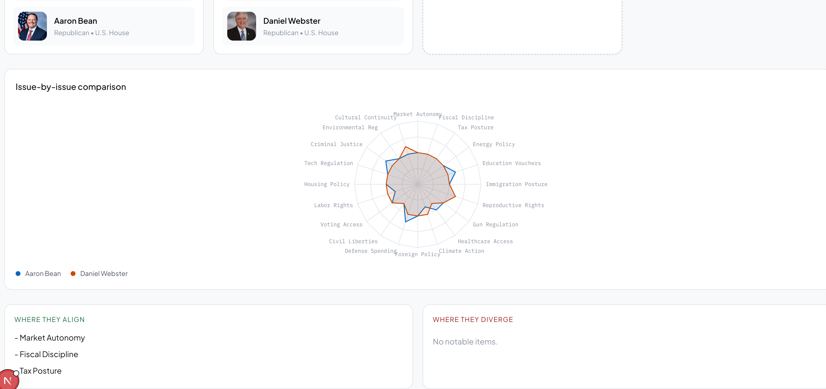 Head-to-head comparison. Radar charts and an issue-by-issue overlap graph show where any two politicians align and diverge across all 20 dimensions simultaneously.