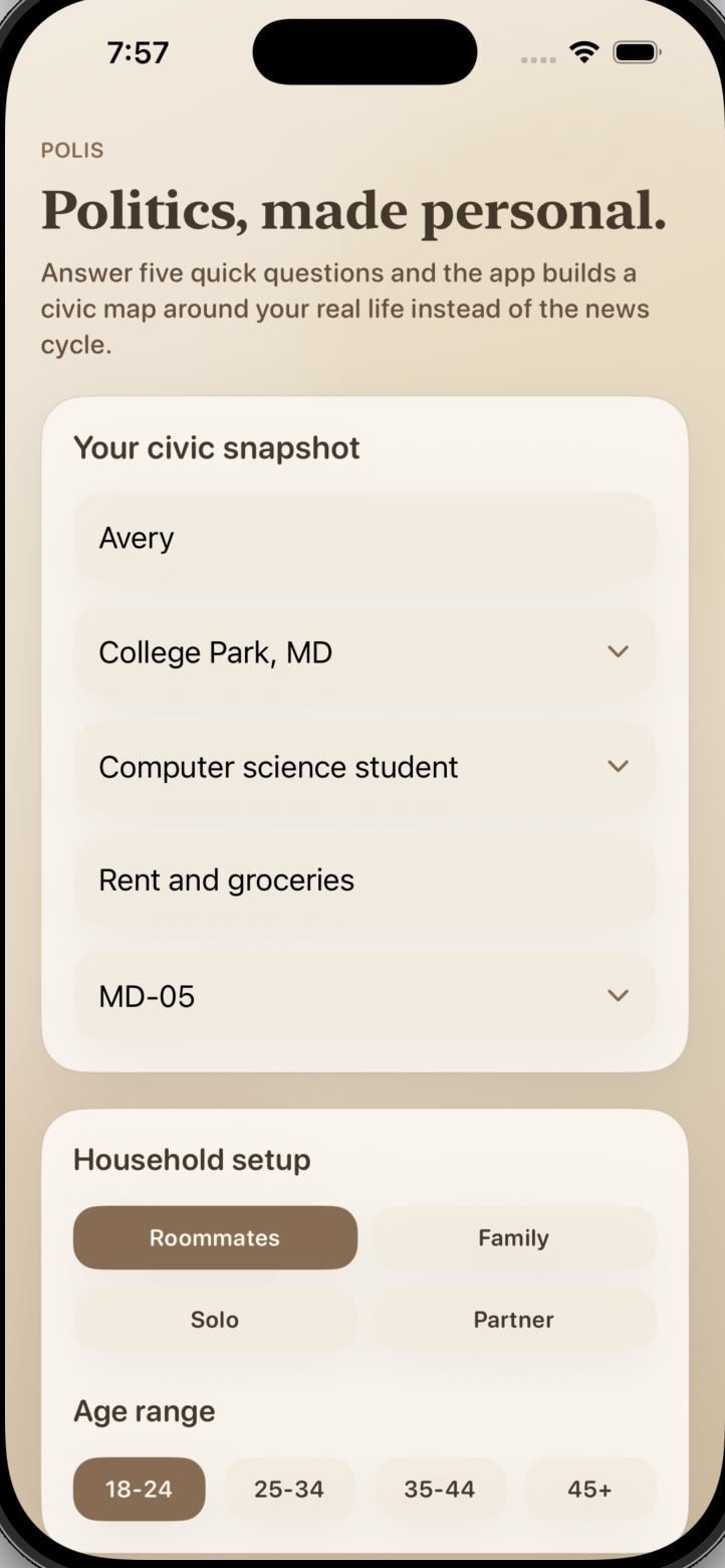 We built Polis as a native iOS app in Swift using SwiftUI and Xcode. The prototype uses a clean MVVM-style structure with reusable UI components, a shared app view model, structured civic data models, and a mock service layer that lets the full product experience run end to end without needing a finished backend yet. We also designed a custom beige and brown visual theme to make the experience feel warm, grounded, and different from the typical loud, stressful political product.
