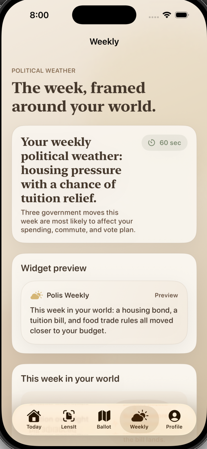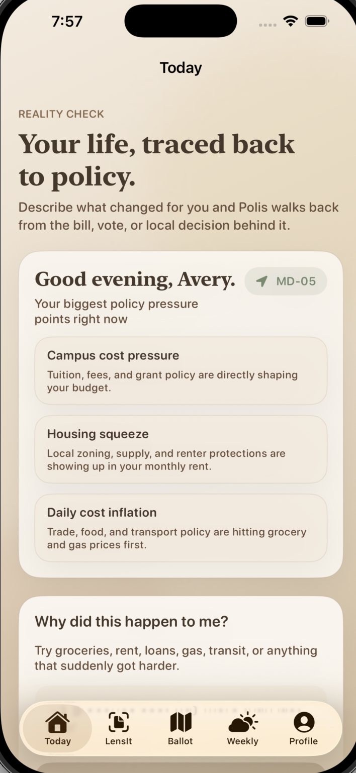 Polis is an iOS app that explains politics through your life, not the news. Users can describe a real-life problem like rising grocery costs, rent increases, or student loan changes, and Polis turns that into a plain-English explanation of the policy decisions, votes, and tradeoffs behind it. The app also includes LensIt for simplifying confusing policy documents, Ballot GPS for making ballots easier to understand, and a weekly political weather report that highlights the issues most likely to affect the user next.