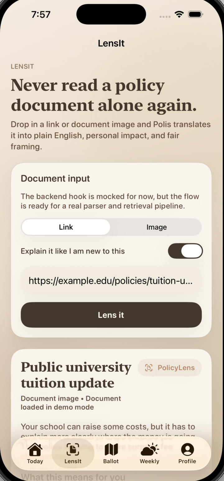 Next, we want to connect Polis to real legislative, representative, and ballot data so the app can move from a strong prototype to a live civic companion. We also want to build the LensIt share extension for policy links and PDFs, add real source citations for every claim, and ship a widget-based political weather report with personalized notifications. Longer term, we see Polis becoming a trusted daily tool that helps people understand not just what is happening in politics, but what it means for them.