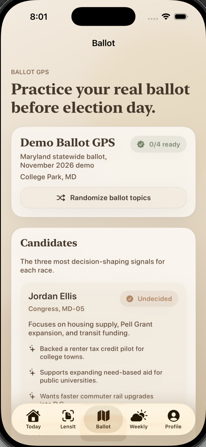 We are proud that we turned a big idea into a working iOS prototype that can actually be opened, run, and demoed. Instead of stopping at mockups, we built the onboarding flow, the personalized event analysis experience, LensIt, Ballot GPS, the weekly briefing screen, and a cohesive design system that makes the whole app feel like one product. We are also proud of the core framing itself: shifting politics from something abstract and partisan into something practical, personal, and understandable.