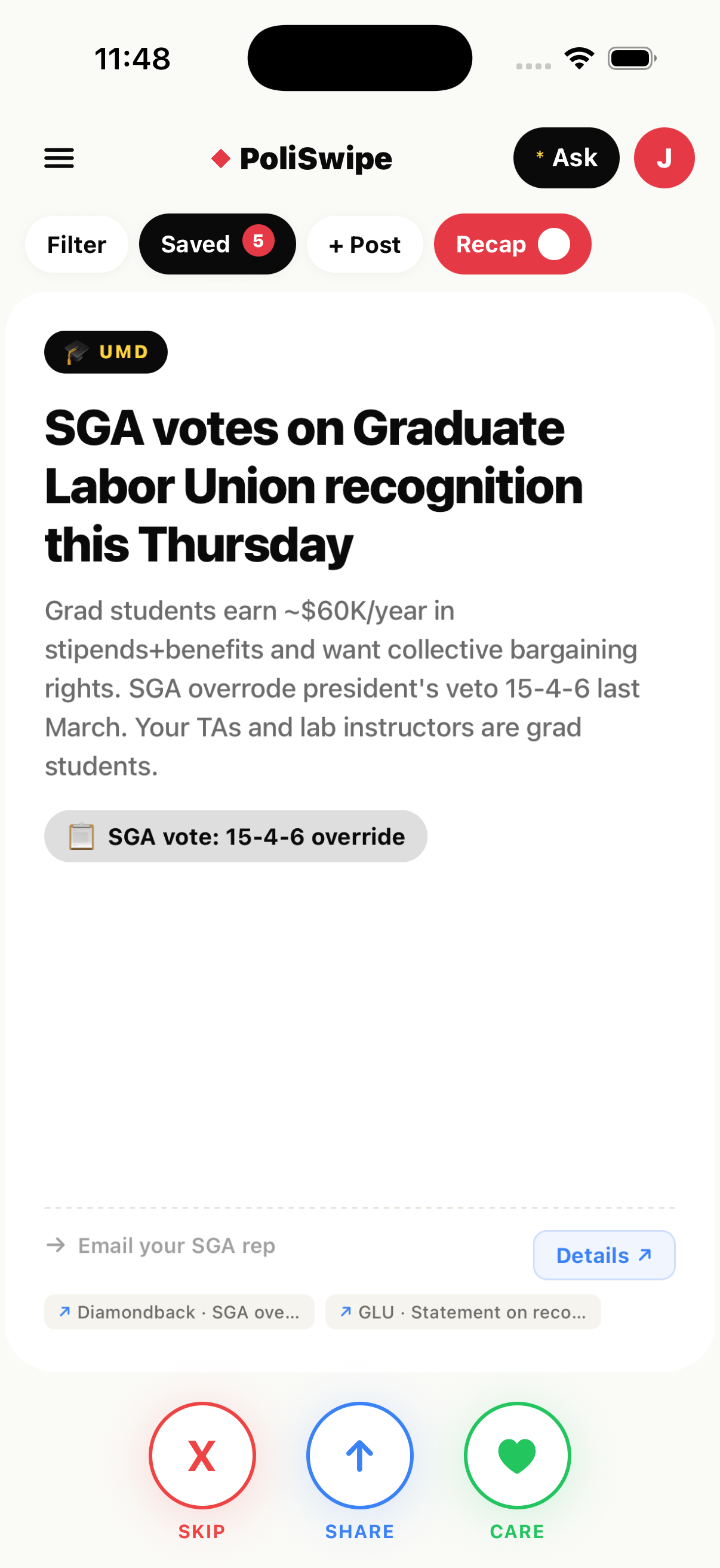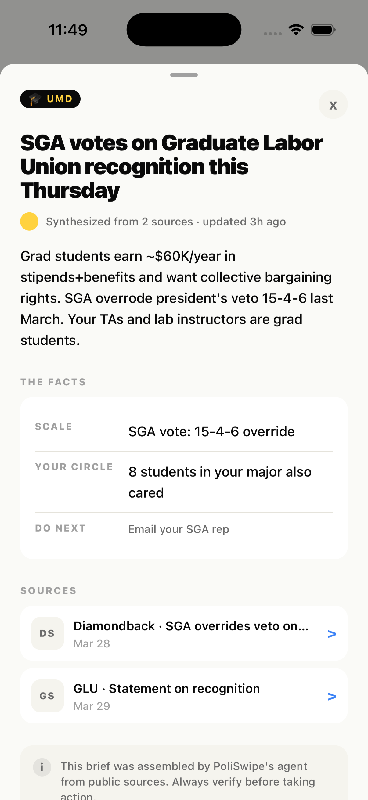 PoliSwipe is a swipe-card app for civic participation. Students swipe through local bills, petitions, rallies, and campus issues -- real ones, like bills in Prince George's County, rallies at Hornbake Plaza, and reps like Del. Pena-Melnyk and Councilmember Franklin.