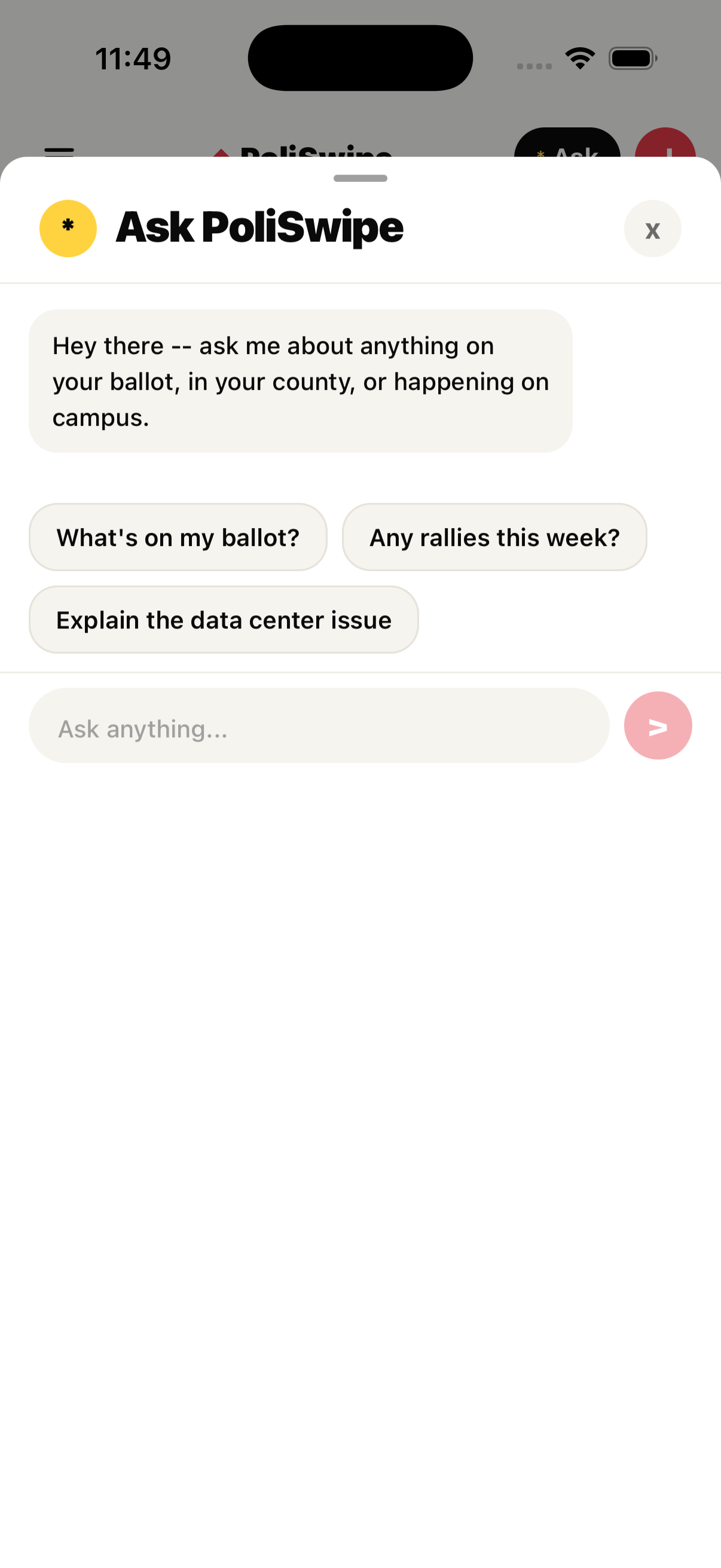 - Privacy: Students type sensitive political opinions into chat. We made the AI endpoints stateless -- no chat history is stored on the backend; messages live in component state and disappear when the sheet closes.