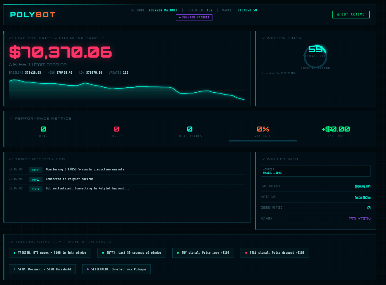- Live oracle integration A key part of the project is connecting blockchain systems with real-world data. Using Chainlink data streams via Polymarket’s WebSocket, the bot receives live Bitcoin price updates every second.