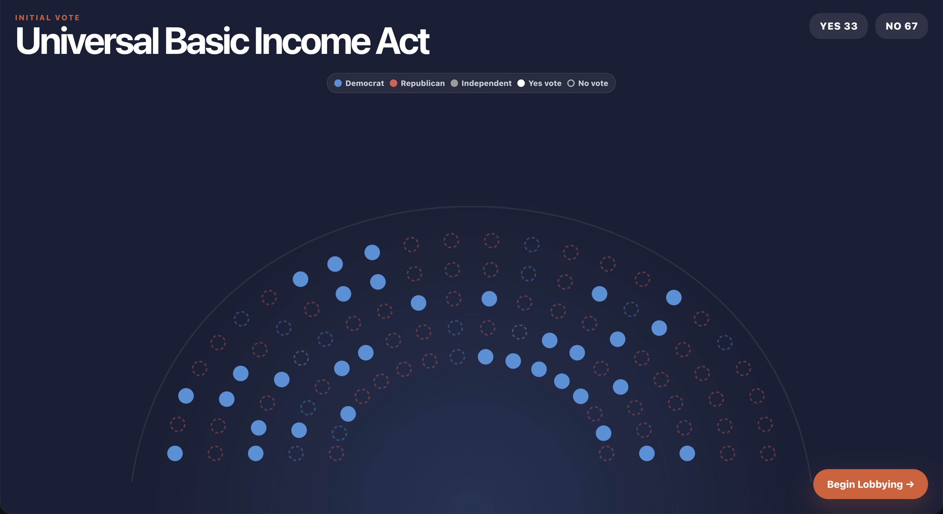 The persuasion score can be positive or negative, which means users can lose sway if they make a hostile, vague, or misaligned argument. This makes the lobbying phase more strategic and less like a guaranteed “AI says yes” button. The simulation follows a simple principle: [ \text{Final Vote} = f(\text{Ideology Alignment}, \text{Influence}, \text{Persuasion}, \text{Randomness}) ] The LLM provides interpretation, but the deterministic simulation engine owns the actual state changes and vote outcomes.