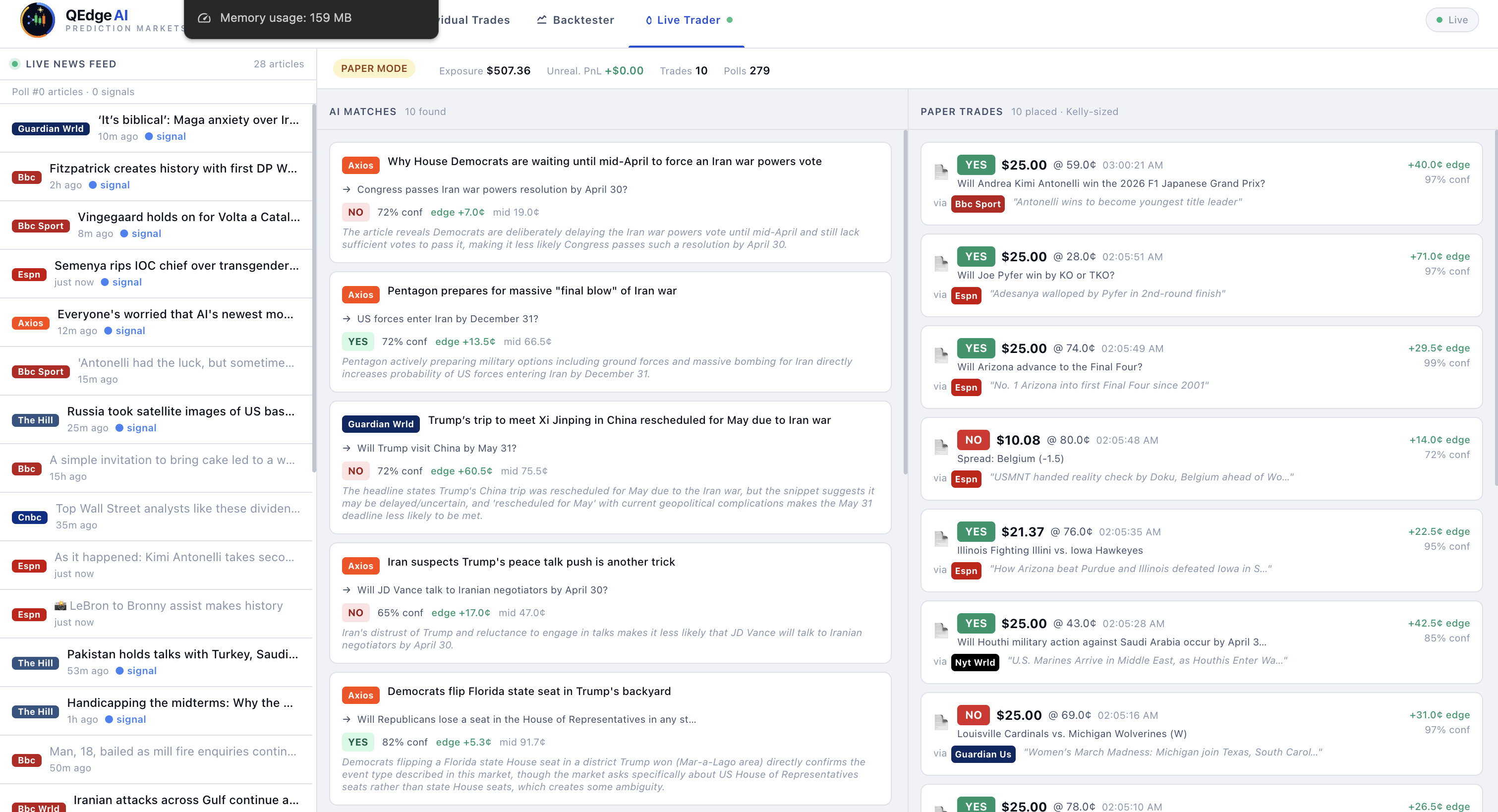 Every event — article ingested, market matched, trade fired or rejected — is pushed to the Live Trader UI in real time via Server-Sent Events with under 5ms delivery latency.