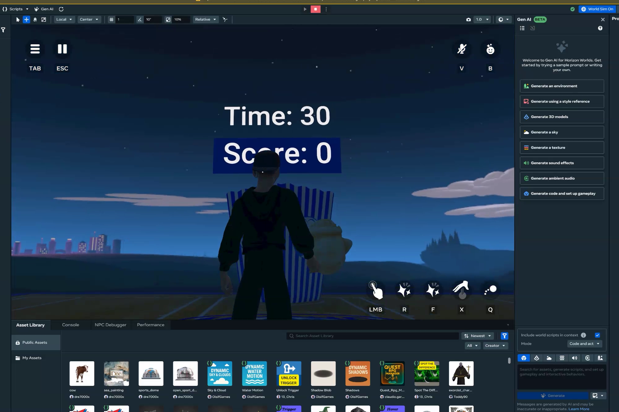I managed to deliver a complete, working game loop with score, timer, respawn, VFX, sound, music, seating, and NPC guidance in a short time. Most importantly, it’s easy for anyone to remix and adapt into their own game by editing the GameSettings.