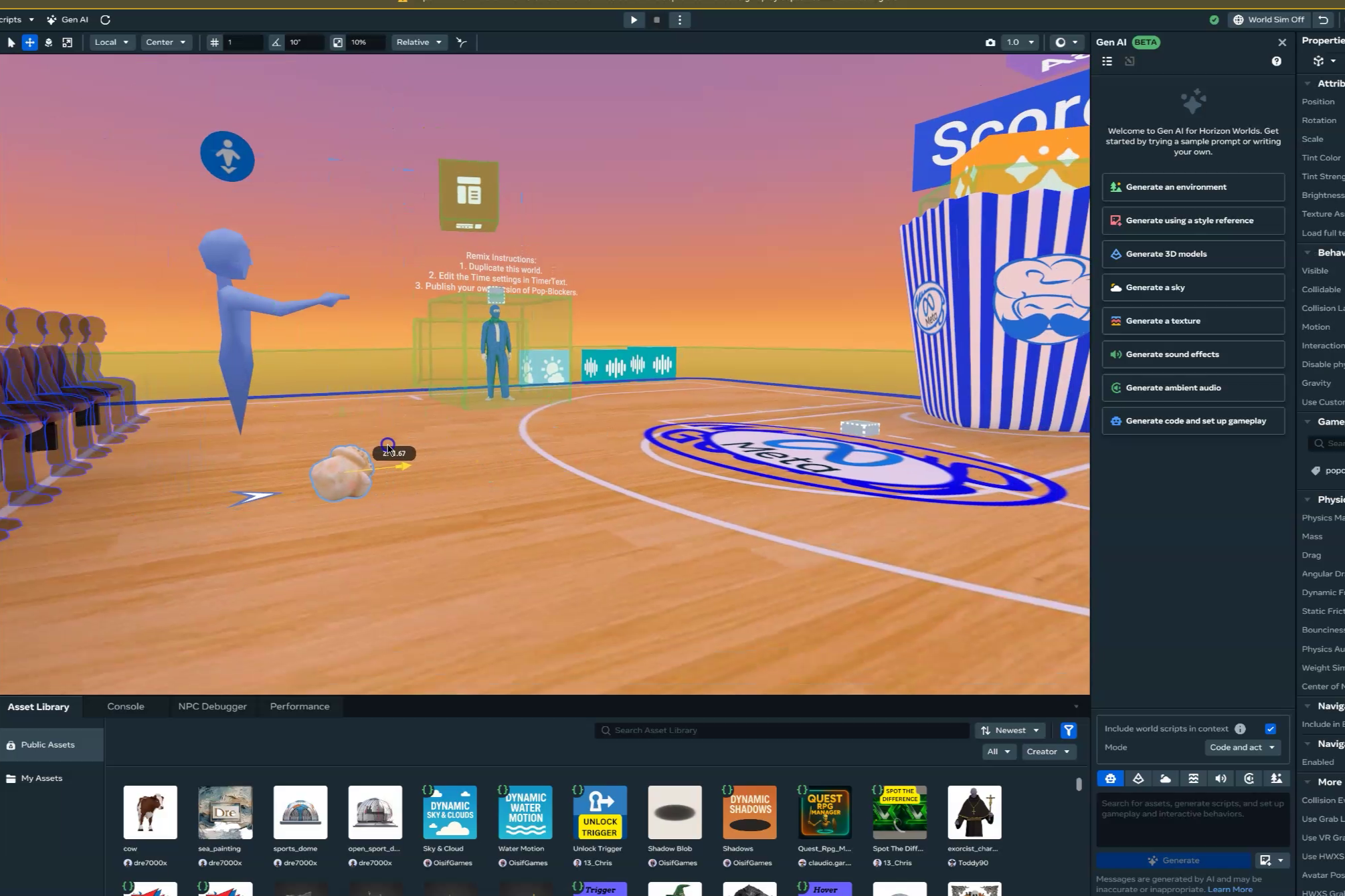 The world is organized inside a GameRoot that contains all the elements, with editable values exposed in a GameSettings object for remixing. The kernel uses a simple respawn system tied to the scoreboard. A 60-second timer starts automatically on the first score, and it can easily be adjusted in GameSettings to 30 seconds or any other value. VFX and audio bring feedback to each goal. The NPC and in-world signs guide both players and remixers. To optimize, a death trigger clears any kernels that fall out of bounds.