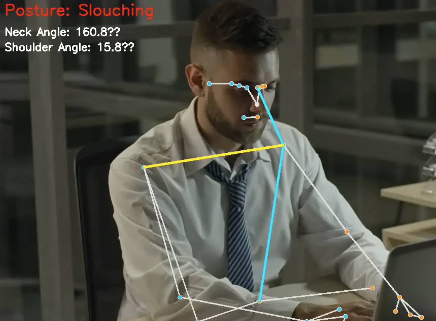 - Posture Analysis: Calculates neck and shoulder angles to determine posture quality