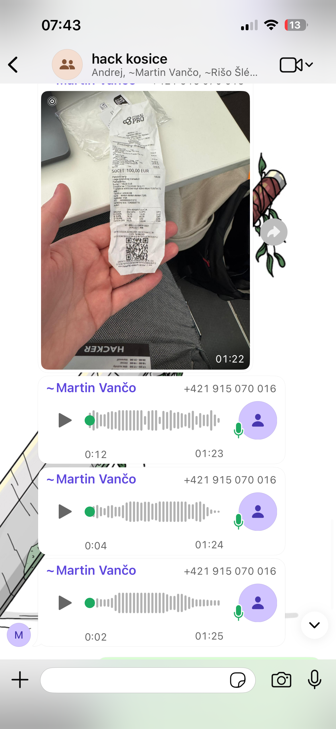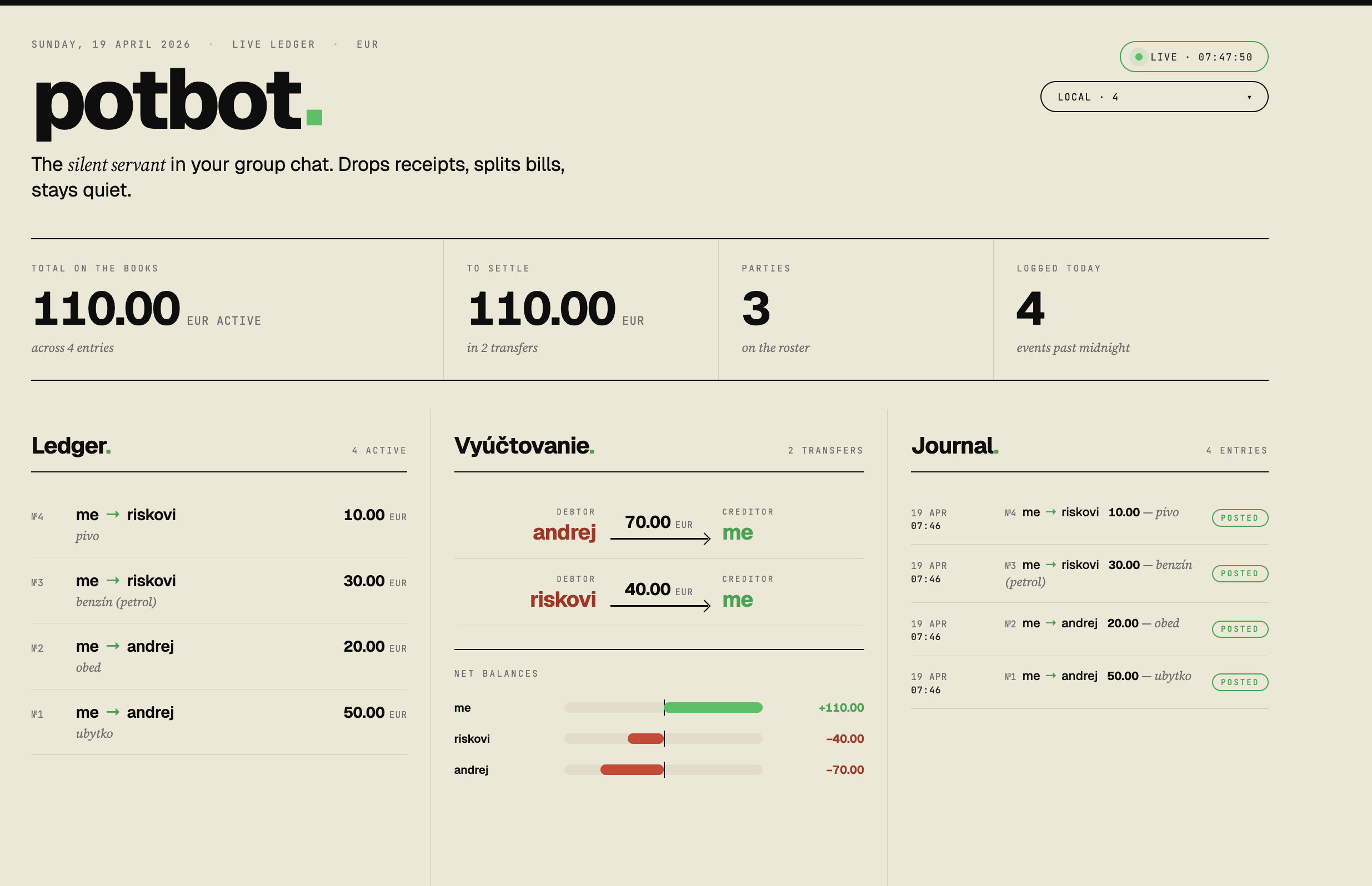 Add the bot to any group, then live normally: type "kupil som pivo za 3", forward a receipt photo, send a voice note saying "andrej mne 10 za benzin", or just write "obed 15". Everything gets parsed and logged silently into a local SQLite ledger.