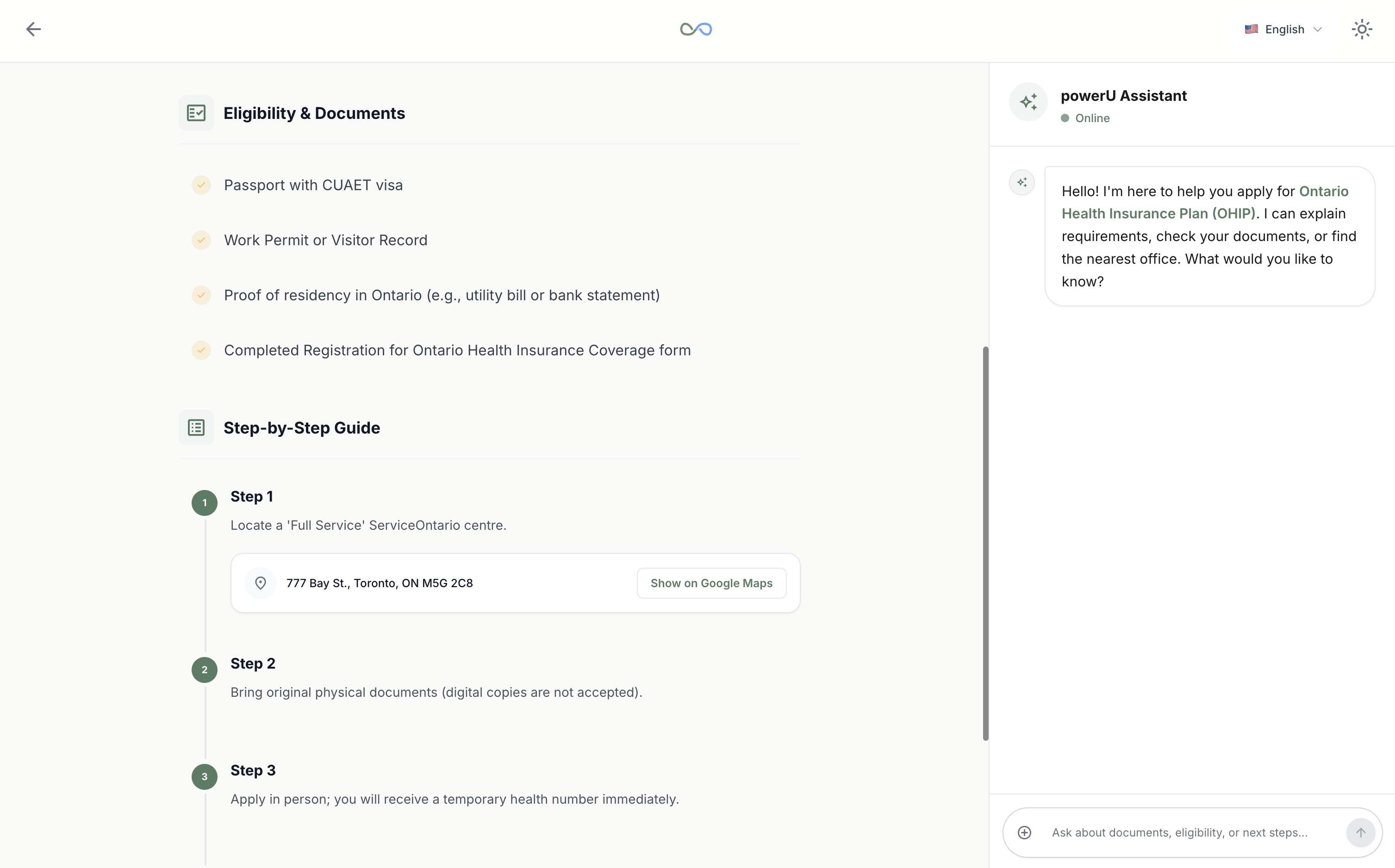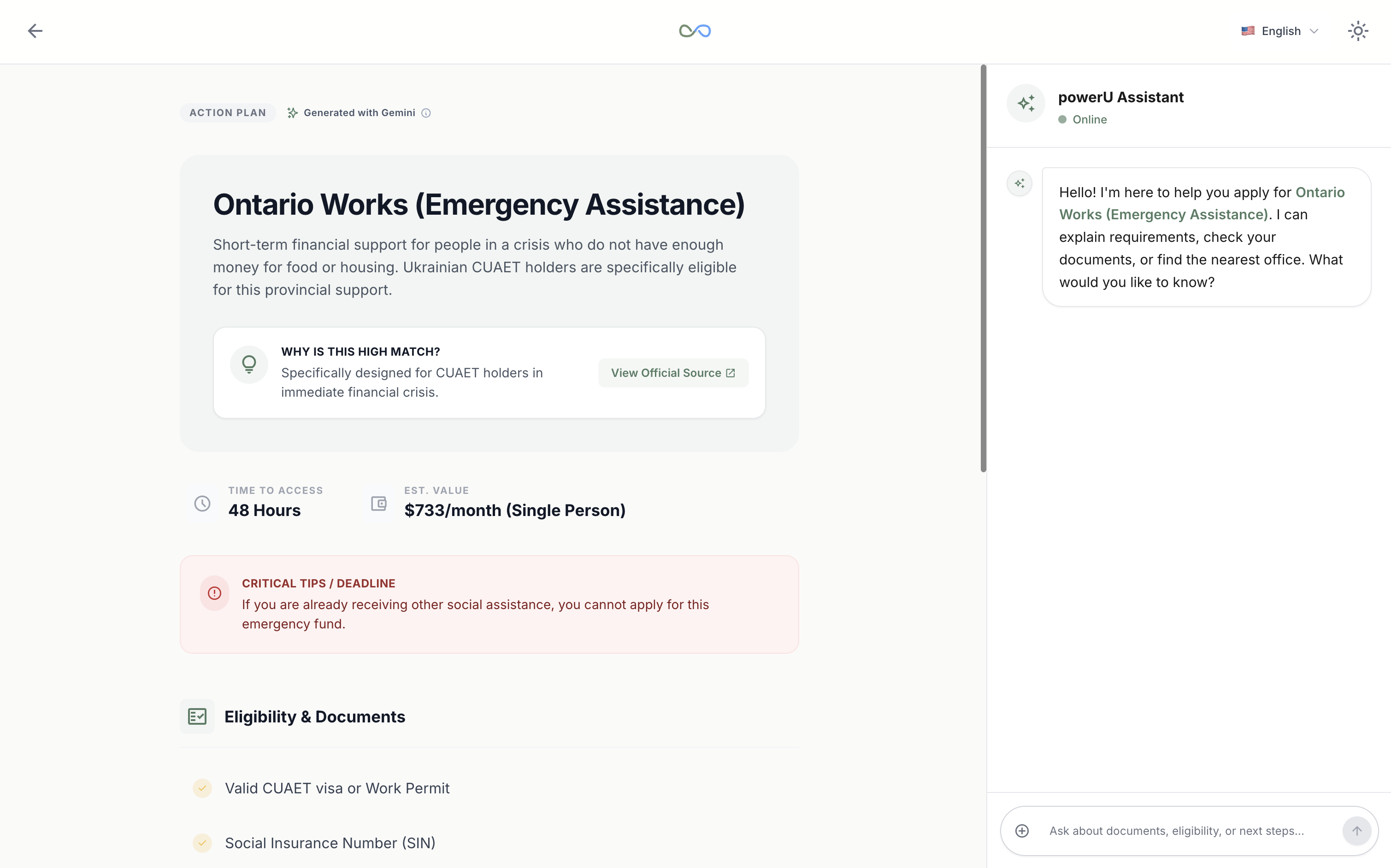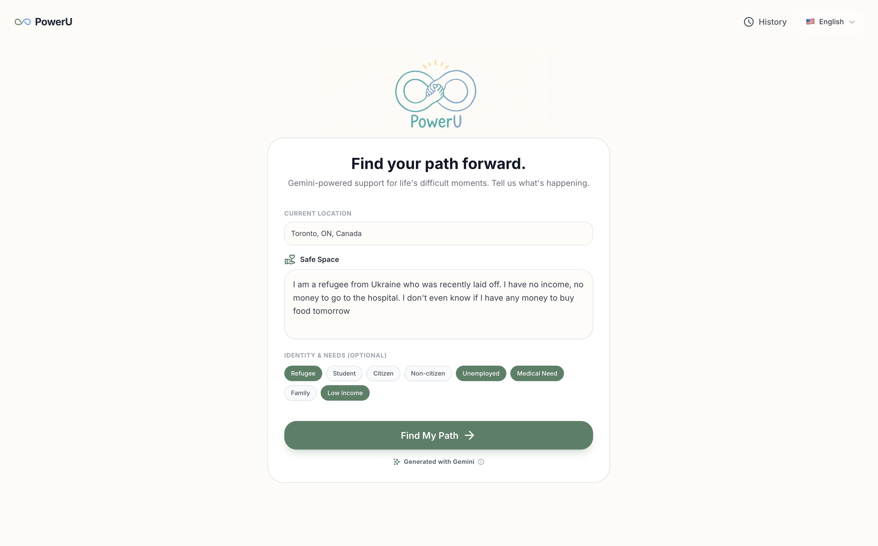 PowerU uses Gemini AI to help people make sense of complex crises and generate clear, actionable paths forward. The system understands multilingual natural language input and uploaded documents, identifies intersecting needs across employment, immigration, healthcare, and housing, and matches users with available support at the federal, state/provincial, municipal, and private levels. It then prioritizes next steps into phased action plans—24-hour emergency response, 7-day stabilization, 30-day rebuilding, and mental health support—while explaining policy terms in plain language, estimating eligible benefits, and clearly guiding users on what to do next at each step.