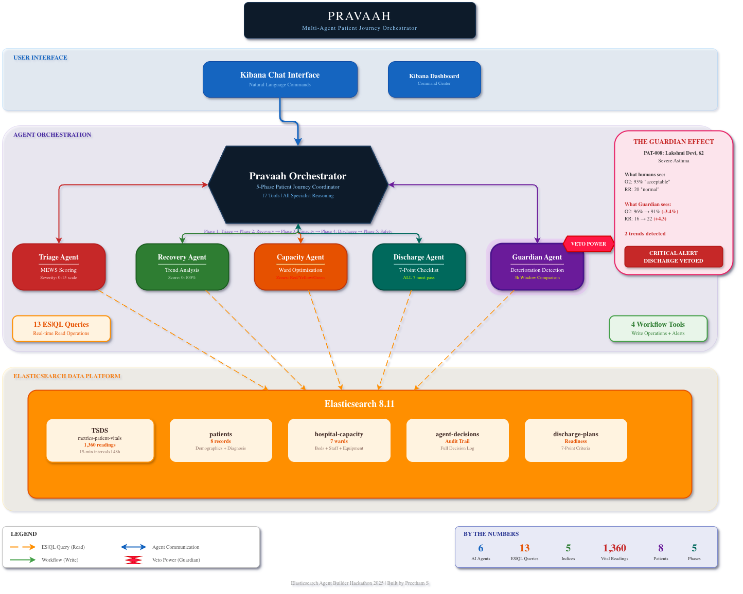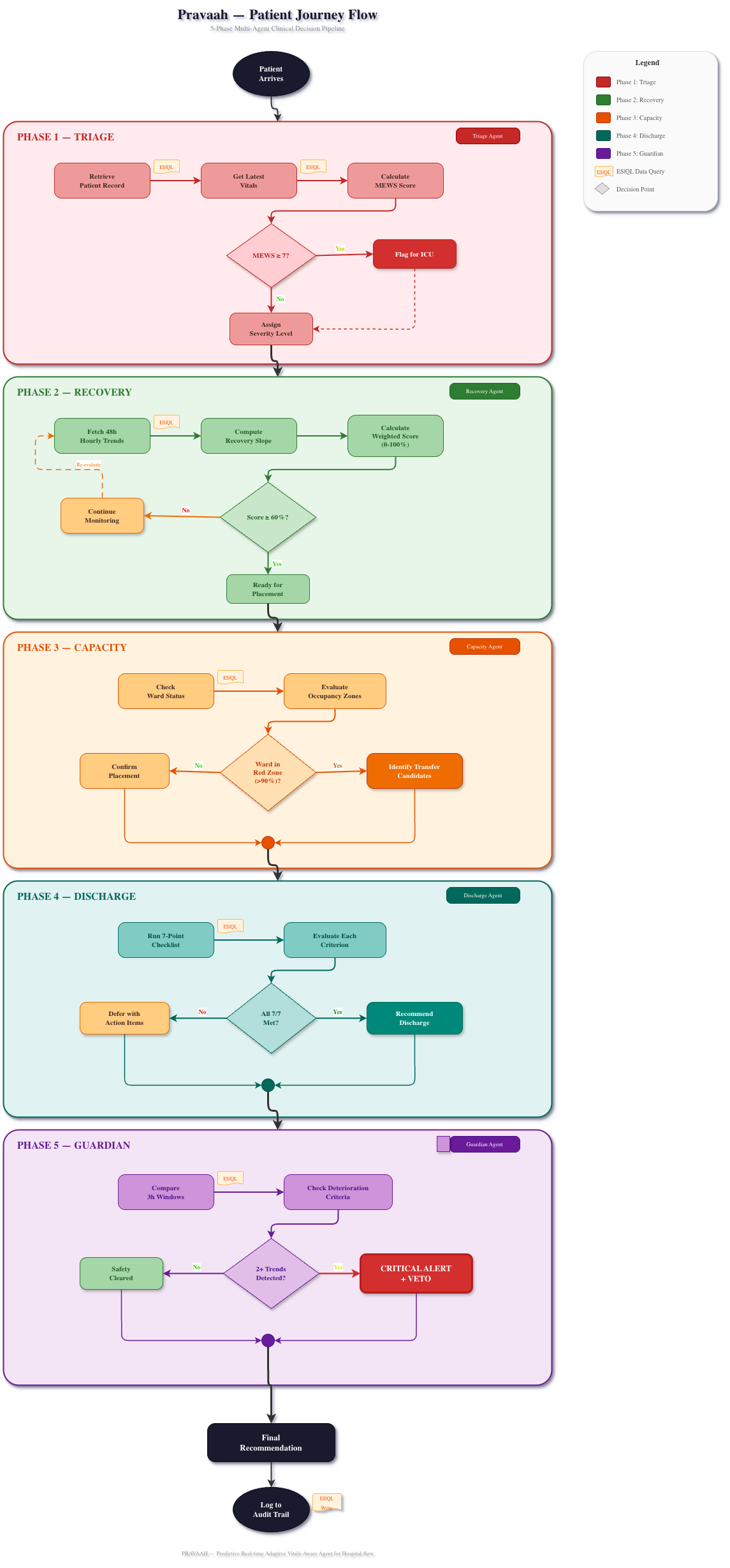 Pravaah (Sanskrit: प्रवाह, "flow") orchestrates 6 specialist AI agents that collaborate to manage the entire patient journey through a hospital — from emergency triage to safe discharge: