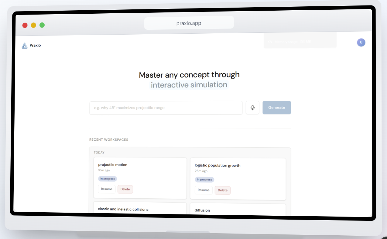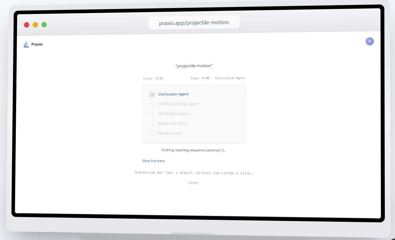 Praxio generates an interactive simulation on demand for a concept the student is stuck on, then guides the student through it with a Socratic voice tutor.