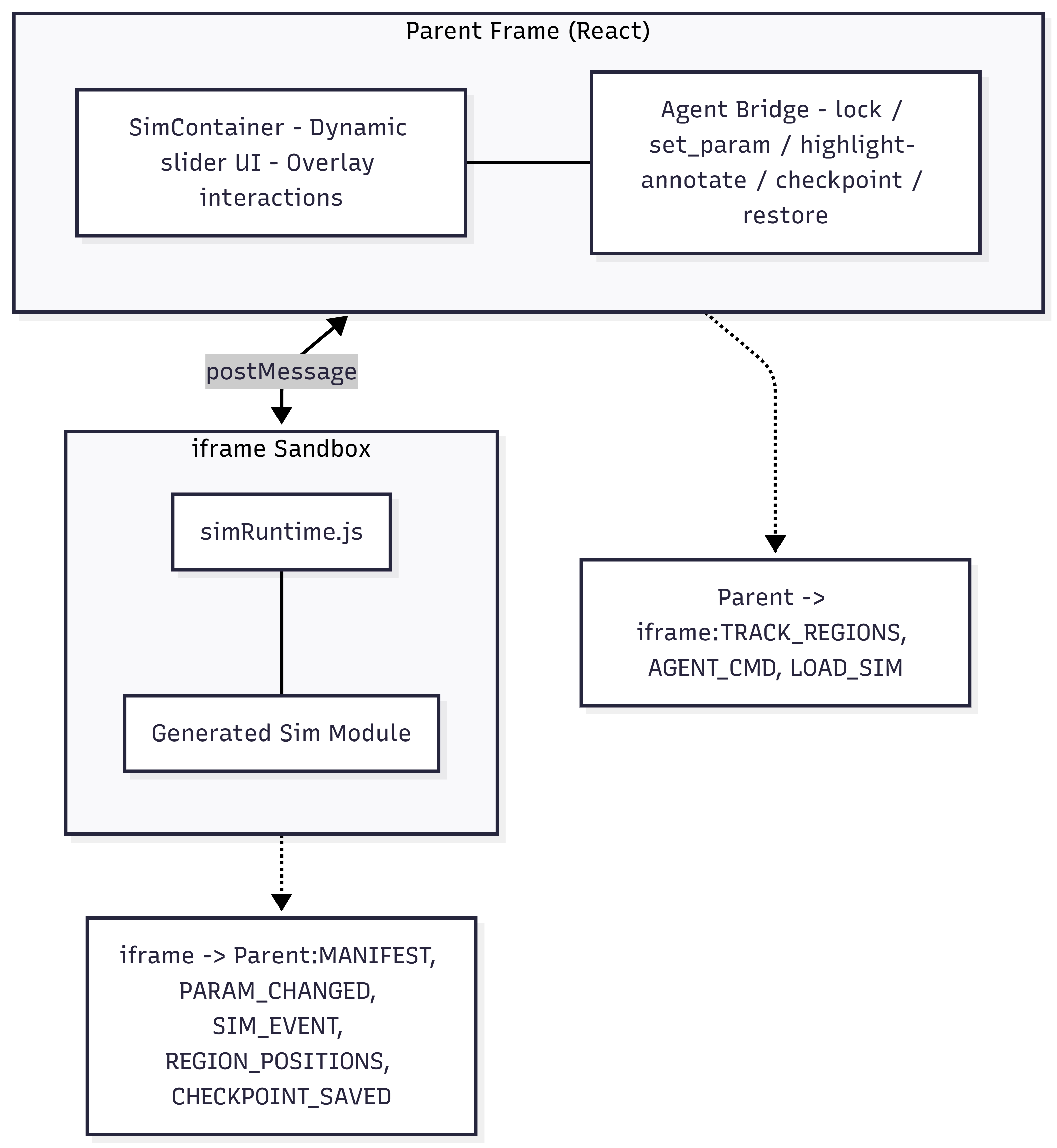 - Simulation runtime: sandboxed iframe + runtime SDK with renderer support (p5.js / JSXGraph / Matter.js / canvas2d)