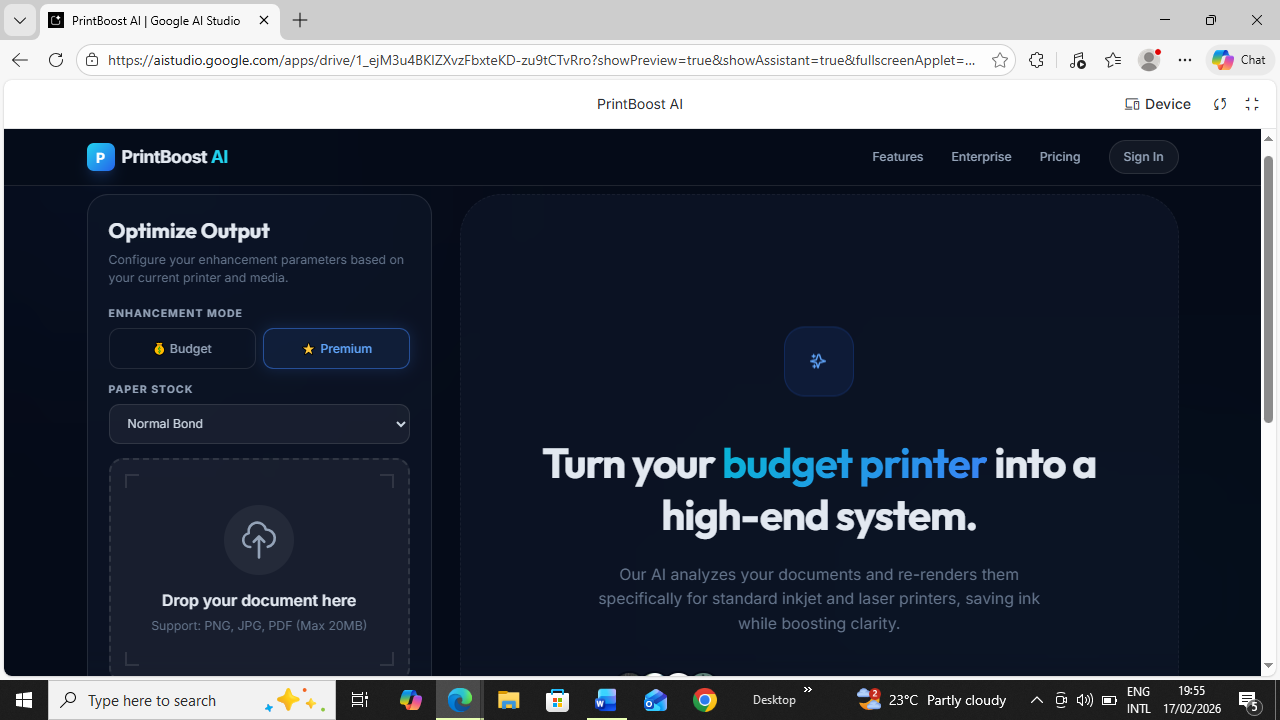 BudgetPrint Pro AI is an AI-powered pre-print optimization engine that enhances documents and images before they are sent to a printer.