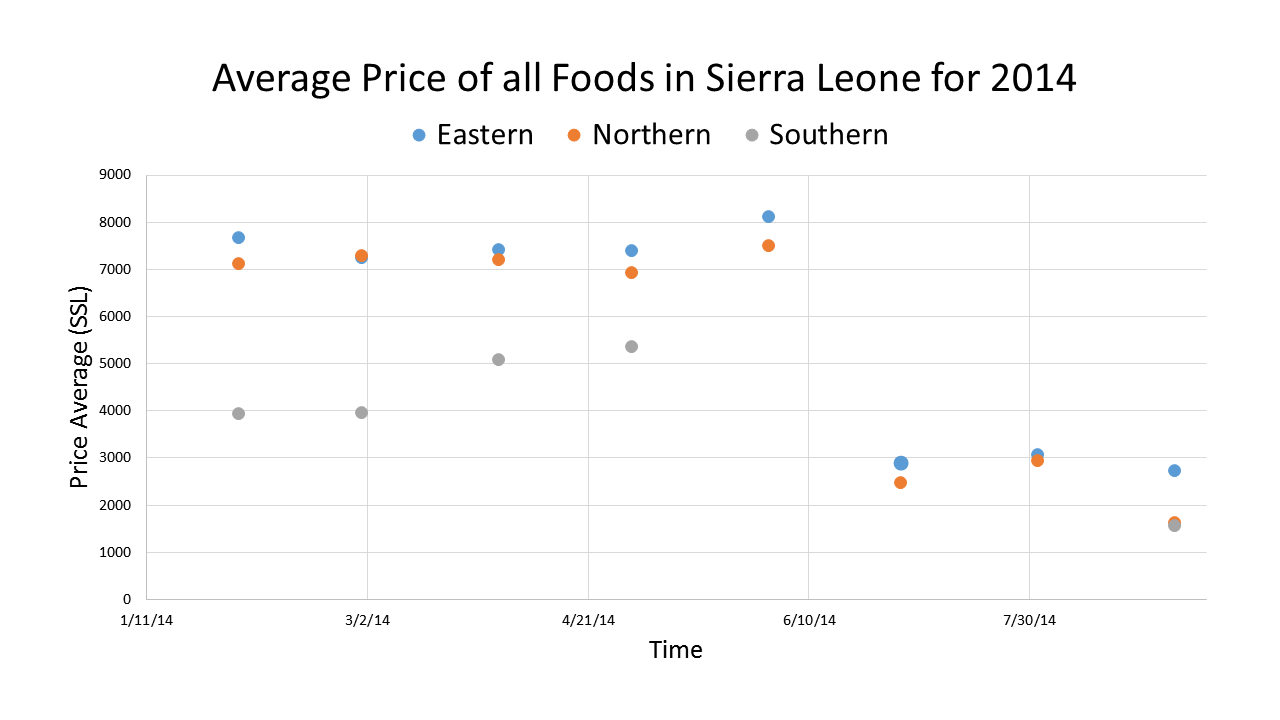 We were interested in looking at the average food cost (from the FOOD PRICES DATASETS FOR THE EBOLA-AFFECTED COUNTRIES) per region (Northern, Southern, and Western) of Sierra Leone in the months during the Ebola outbreak in 2014.
