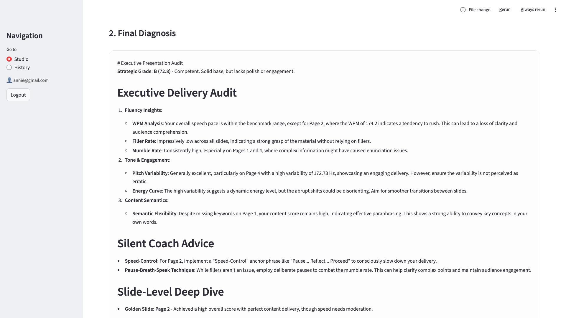 Cracking the "Black Box" of Public Speaking Presentation mastery isn't just about beautiful slides or perfect grammar; it's about the Multimodal Alignment between visual content and verbal delivery. I realized that most rehearsal tools provide "hollow" feedback—a generic score that doesn't tell you where you failed.