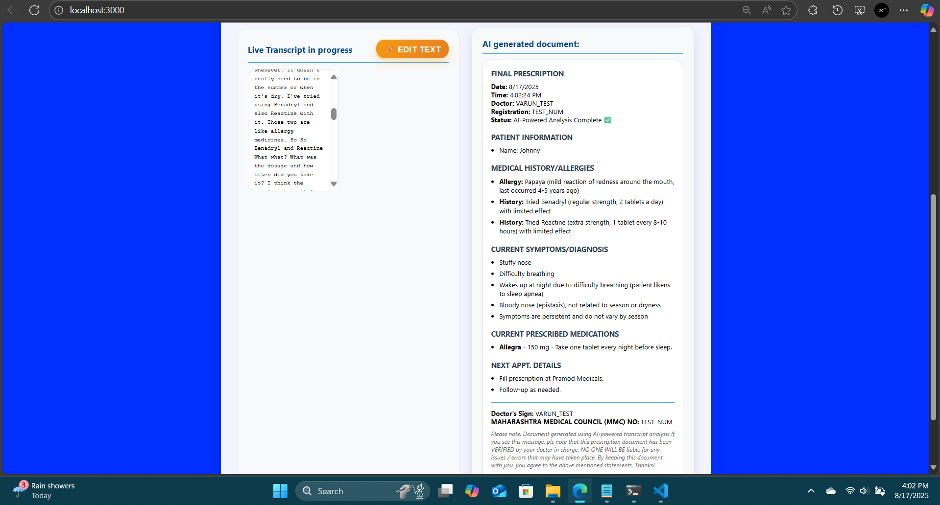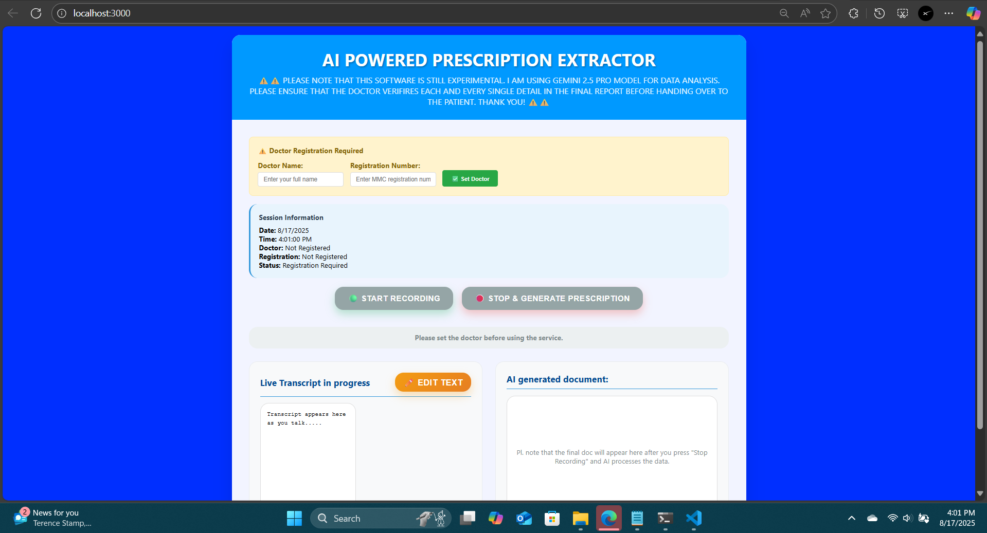 The app basically listens in on a doctor-patient consultation. The doctor presses "Record COnversation" only after the patient consents to recording. Then throughout the consult, a live transcript is generated of the conversation. At the end, the doctor has to press "Stop and Generate prescription". Then, an AI Model (i am using Gemini 2.5-Pro) will process the transcript and then return the final prescription which contains all the necessary details of the consult and excludes the irrelevant details.