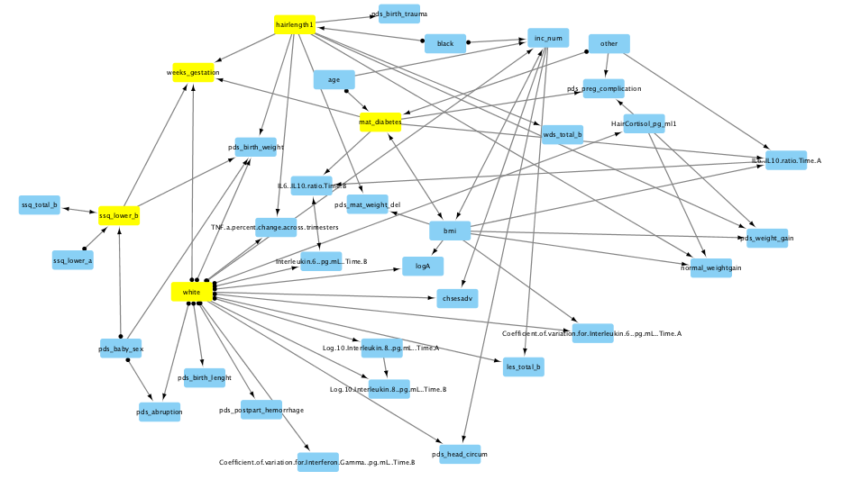 Approximates the causal structure in a dataset of stress and demographic variables on pregnant women.