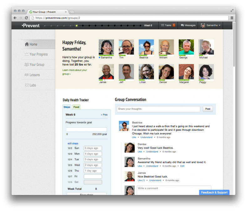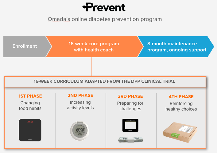 Omada Health's flagship app, Prevent, is an online version of the landmark Diabetes Prevention Program (DPP) clinical trial, which showed that a 16-week intensive lifestyle therapy can help people with prediabetes lose weight and reduce the risk of developing type 2 diabetes. Prevent places participants into small online groups led by a professional health coach, who help one another overcome psychological barriers to weight loss and maintenance. Participants are guided through an evidence-based curriculum and track their progress using digital tools such as a wireless scale and pedometer. Improvements in participants' diet, exercise, weight, mood, and well-being are measured.