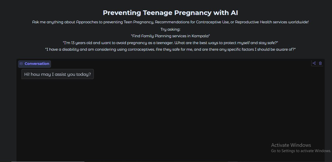 I decided to develop an AI-powered chatbot to empower young girls with essential knowledge on teenage pregnancy prevention, contraceptive recommendations, and access to reproductive health services worldwide. My goal is to ensure that every girl, regardless of her circumstances, has access to the information she needs to make informed choices about her future.