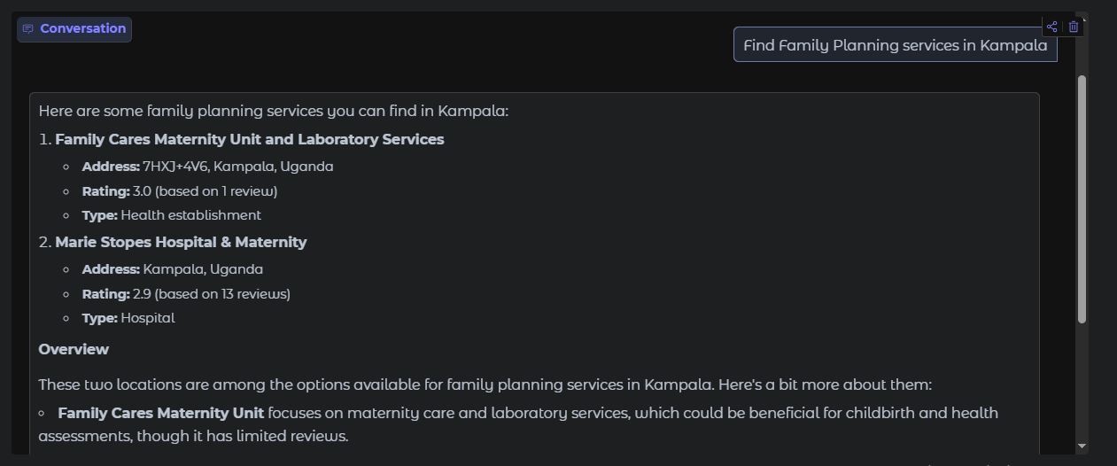 By analyzing these resources, the AI assistant can answer questions about effective strategies for preventing teen pregnancy and contraceptive recommendations. Additionally, using the Google Places API, it can locate reproductive health services for users anywhere in the world, ensuring young girls have access to the support they need.
