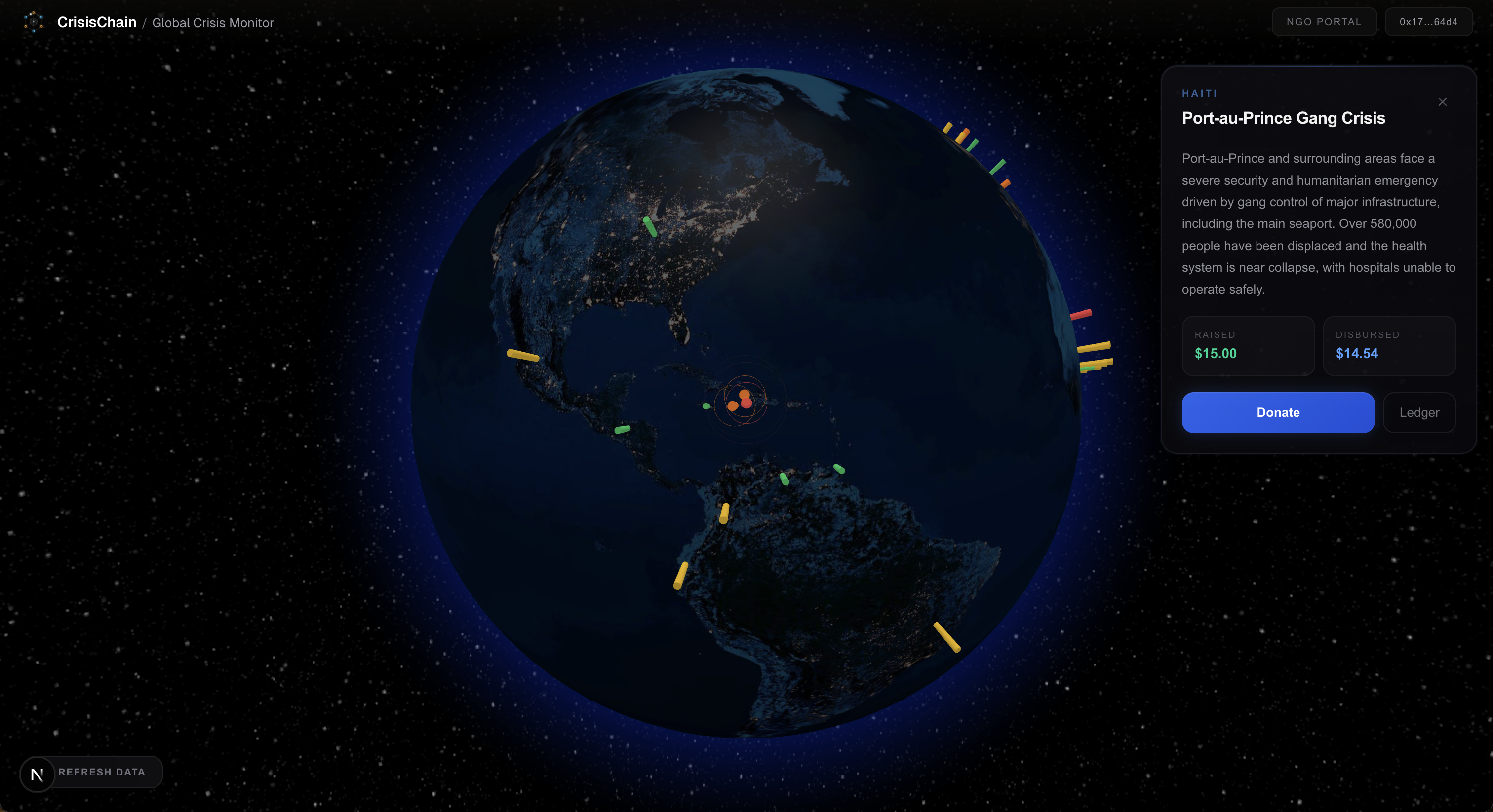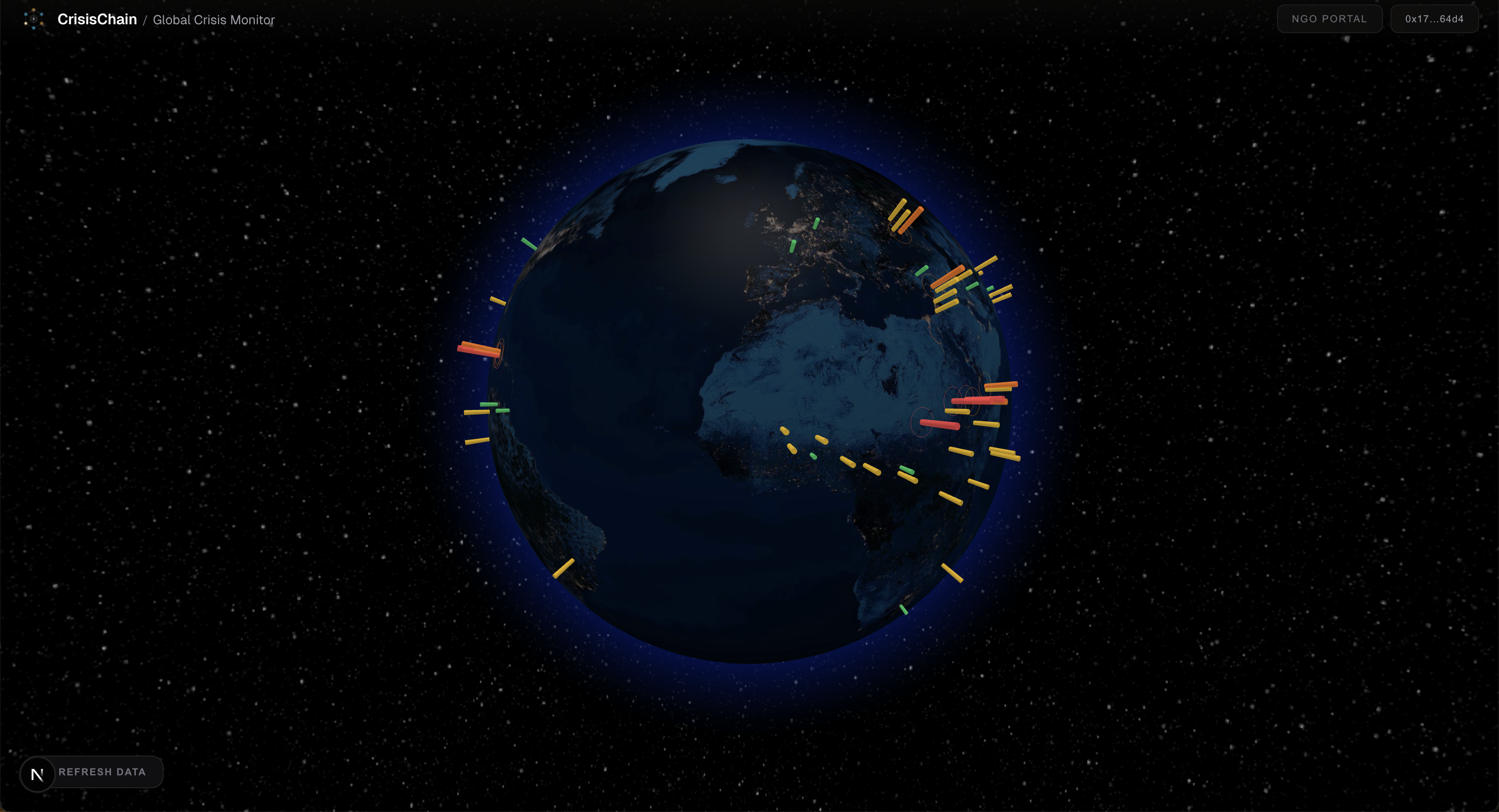 For the frontend, we built a Next.js application using TypeScript, wagmi, viem, and RainbowKit for wallet connectivity. The crisis visualization layer uses react-globe.gl and Three.js to display live global crisis data.