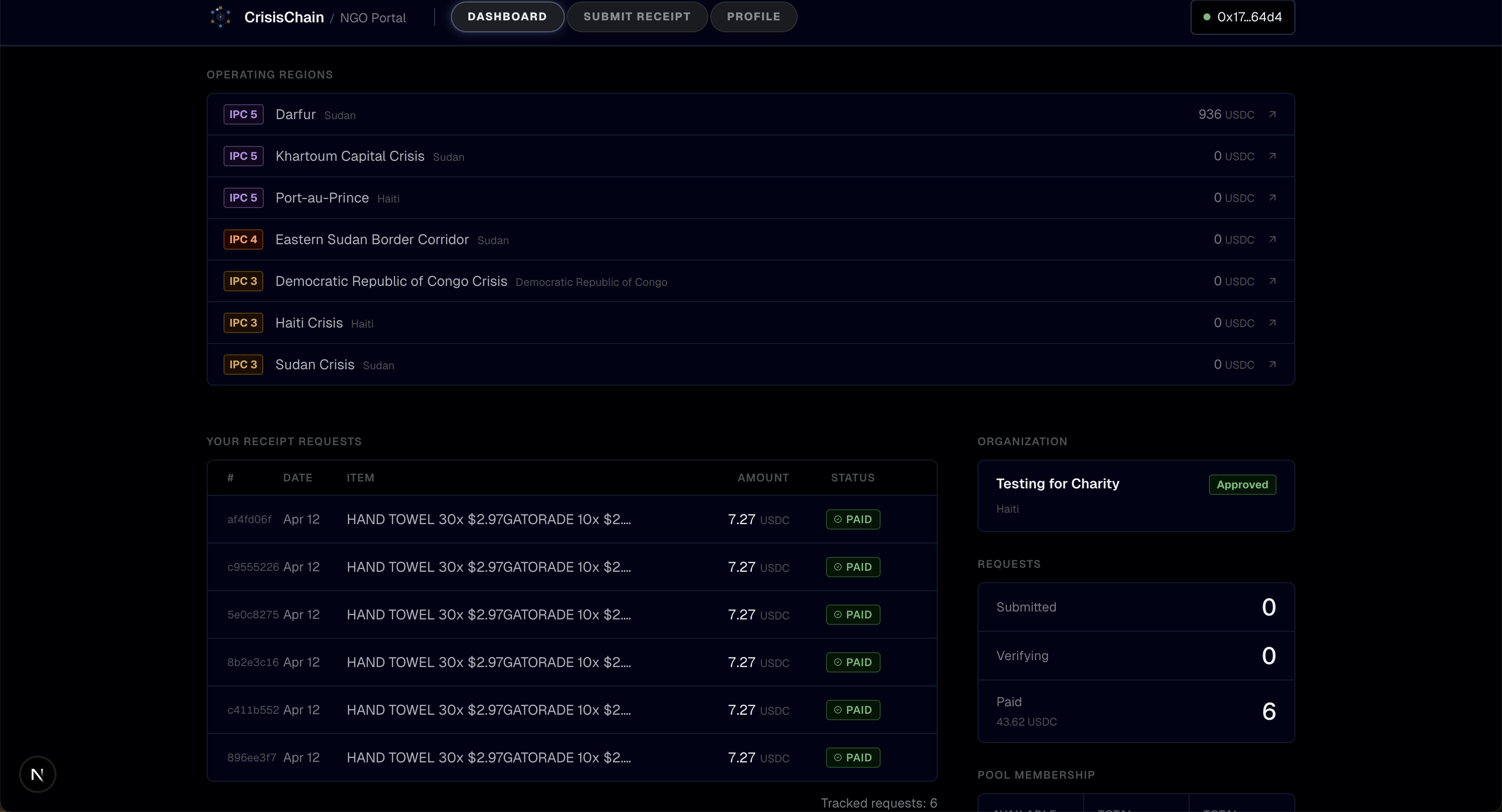 When NGOs purchase supplies—such as food, medicine, or shelter materials—they upload receipts through the platform. CrisisChain verifies these purchases and automatically reimburses the NGO from the regional fund, providing instant settlement without the delays and fees associated with international wire transfers.