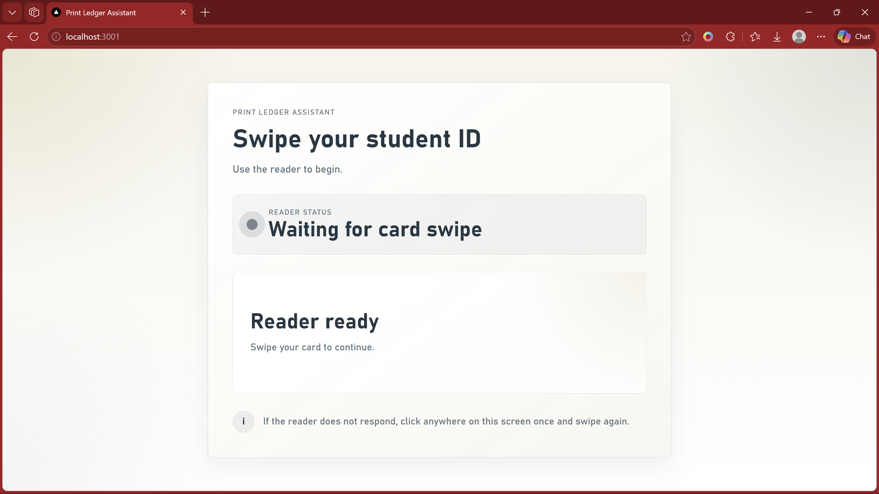 Print Ledger Assistant is a web-based kiosk system built for the DFX 3D Print Lab at USF. Students swipe their USF MCR ID card to authenticate, then log their print job with the file name, estimated print time, filament weight, and job reason. The system shows live printer availability, assigns them to an open printer, and starts a timed session. Admins swipe into a separate dashboard where they can monitor the full printer fleet in real time, view job history per student, manage filament levels, set weekly print limits (max hours and grams), and get watchdog alerts when unauthorized printer activity is detected. Sessions auto-close after inactivity, keeping the kiosk clean and ready for the next person.