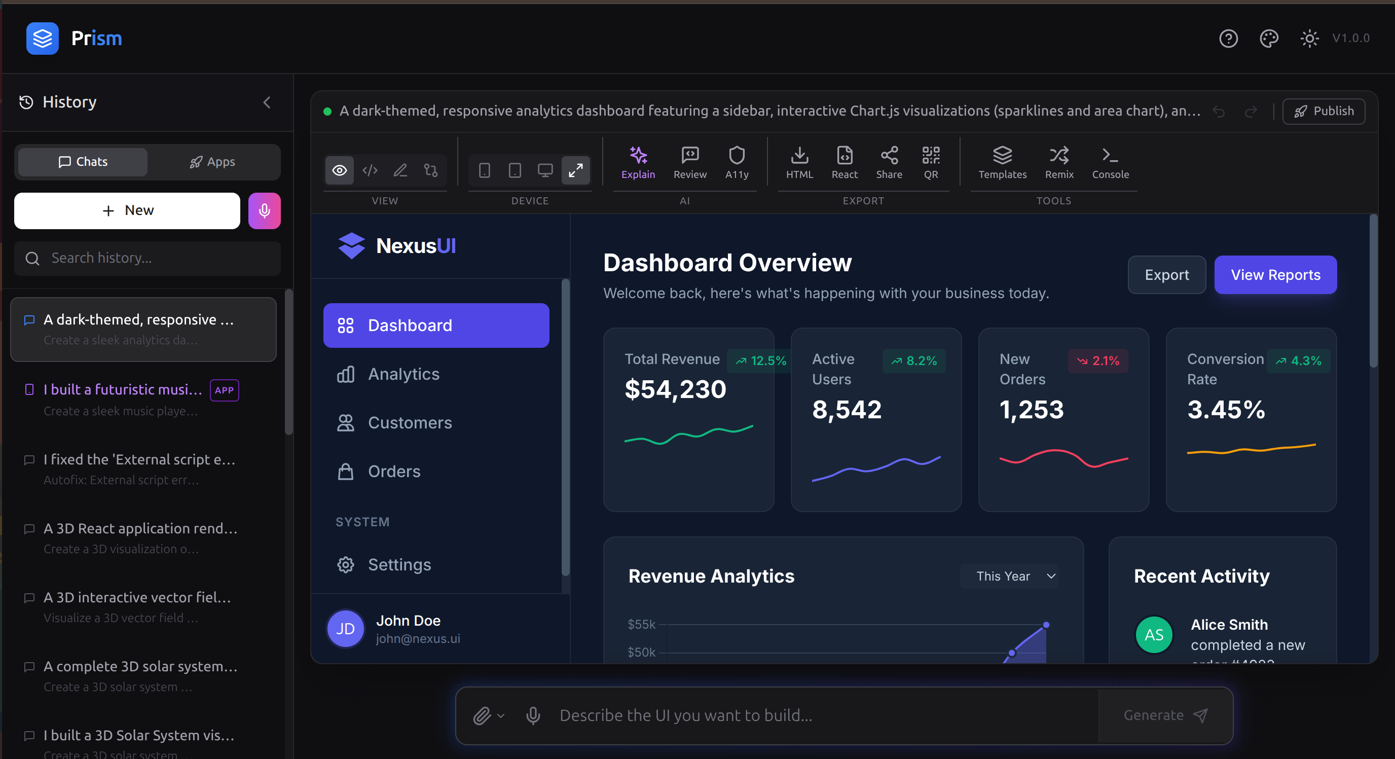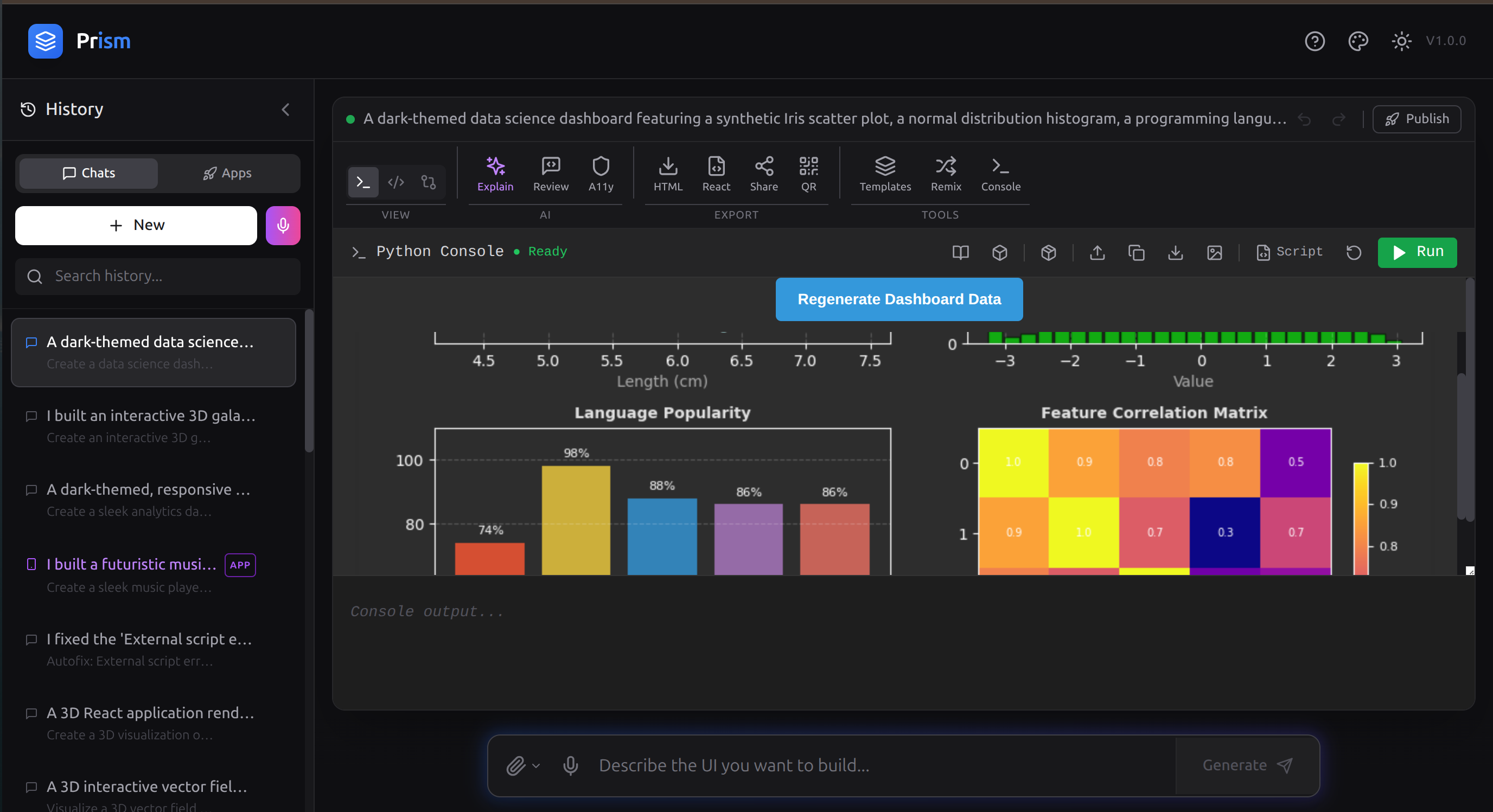 - 15+ built-in templates spanning dashboards, landing pages, games, 3D scenes, and data visualizations