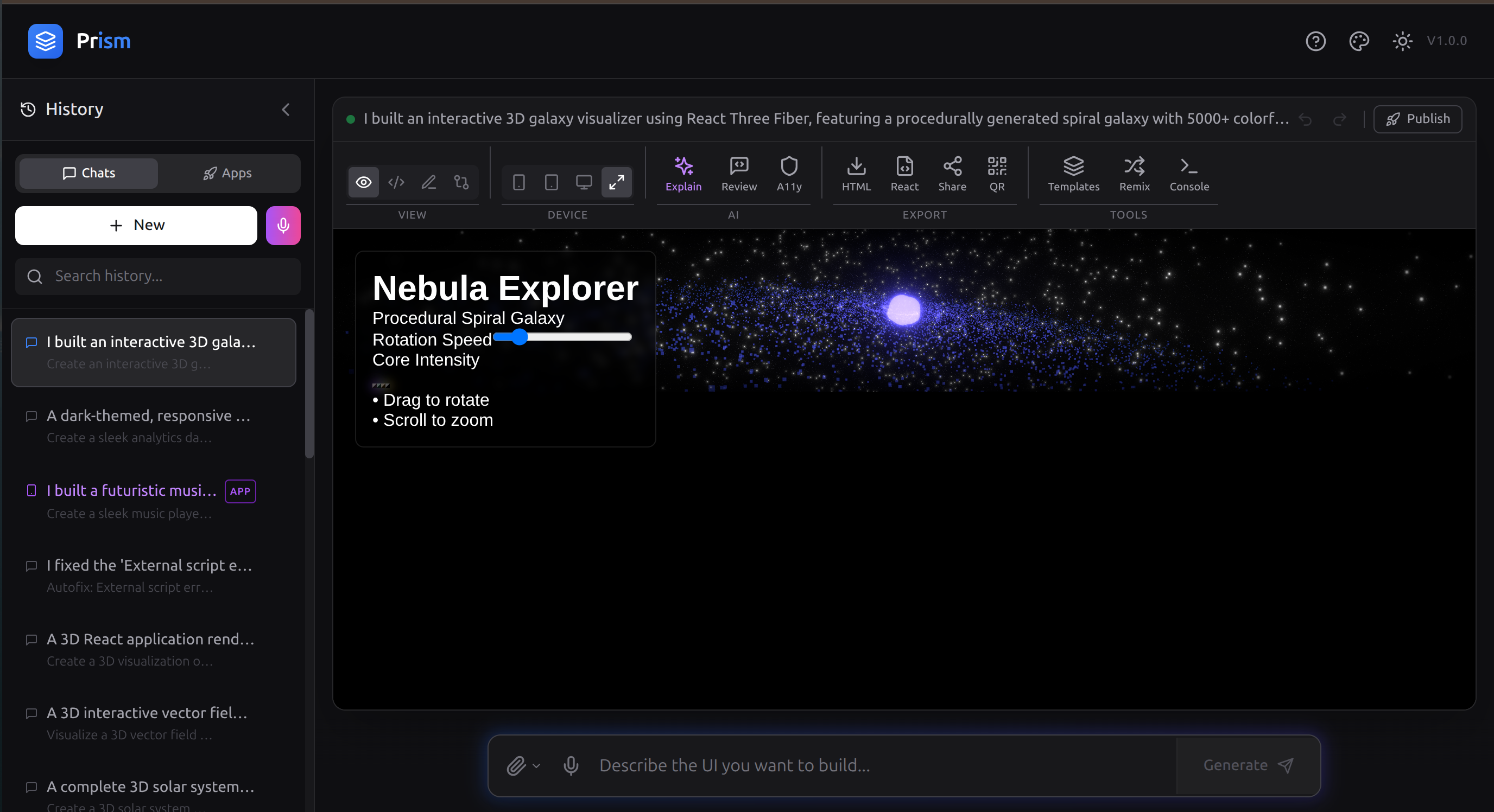 - 3D WebGL Scenes — interactive React Three Fiber visualizations with physics and post-processing (no other AI code tool does this)