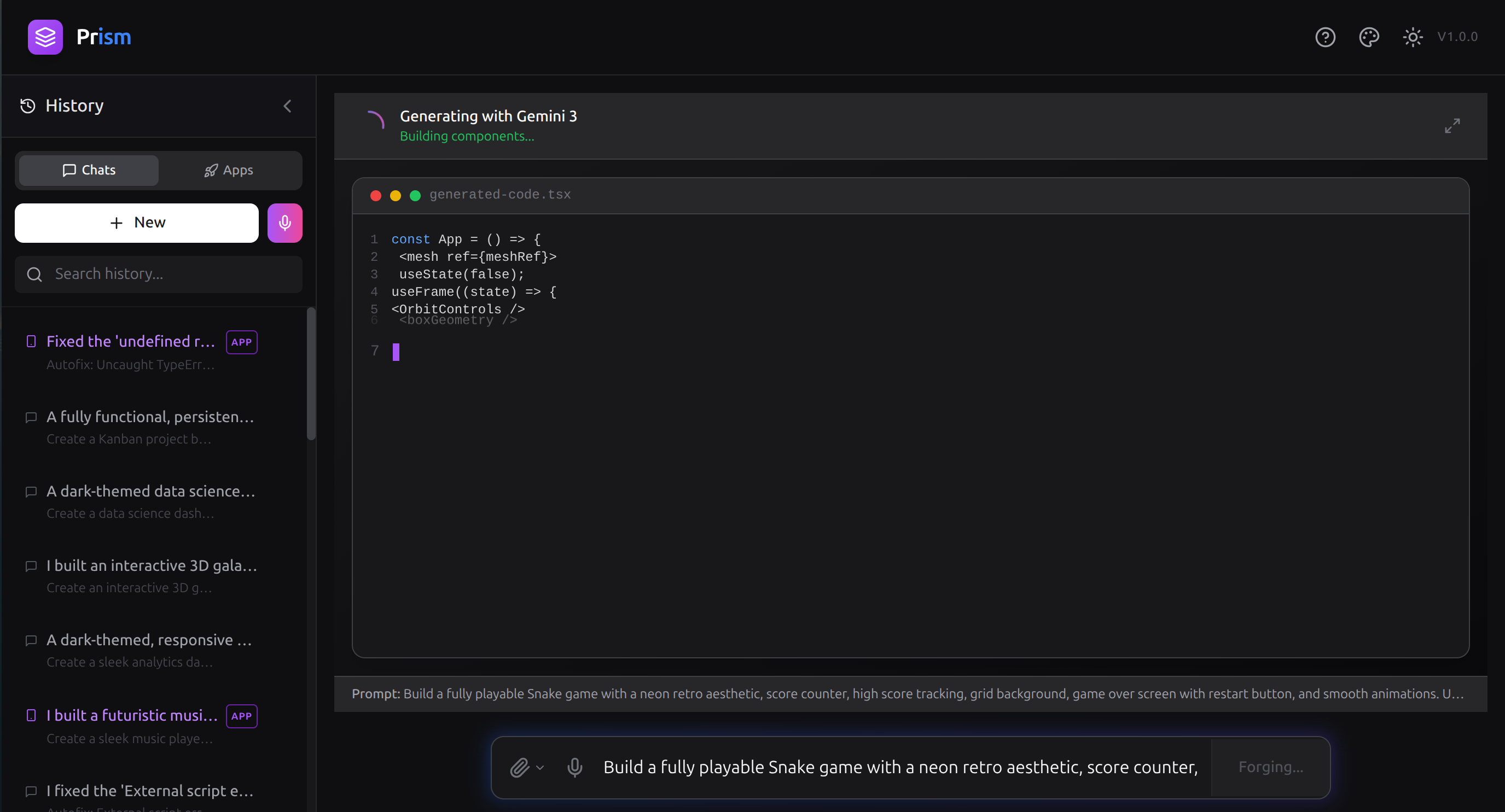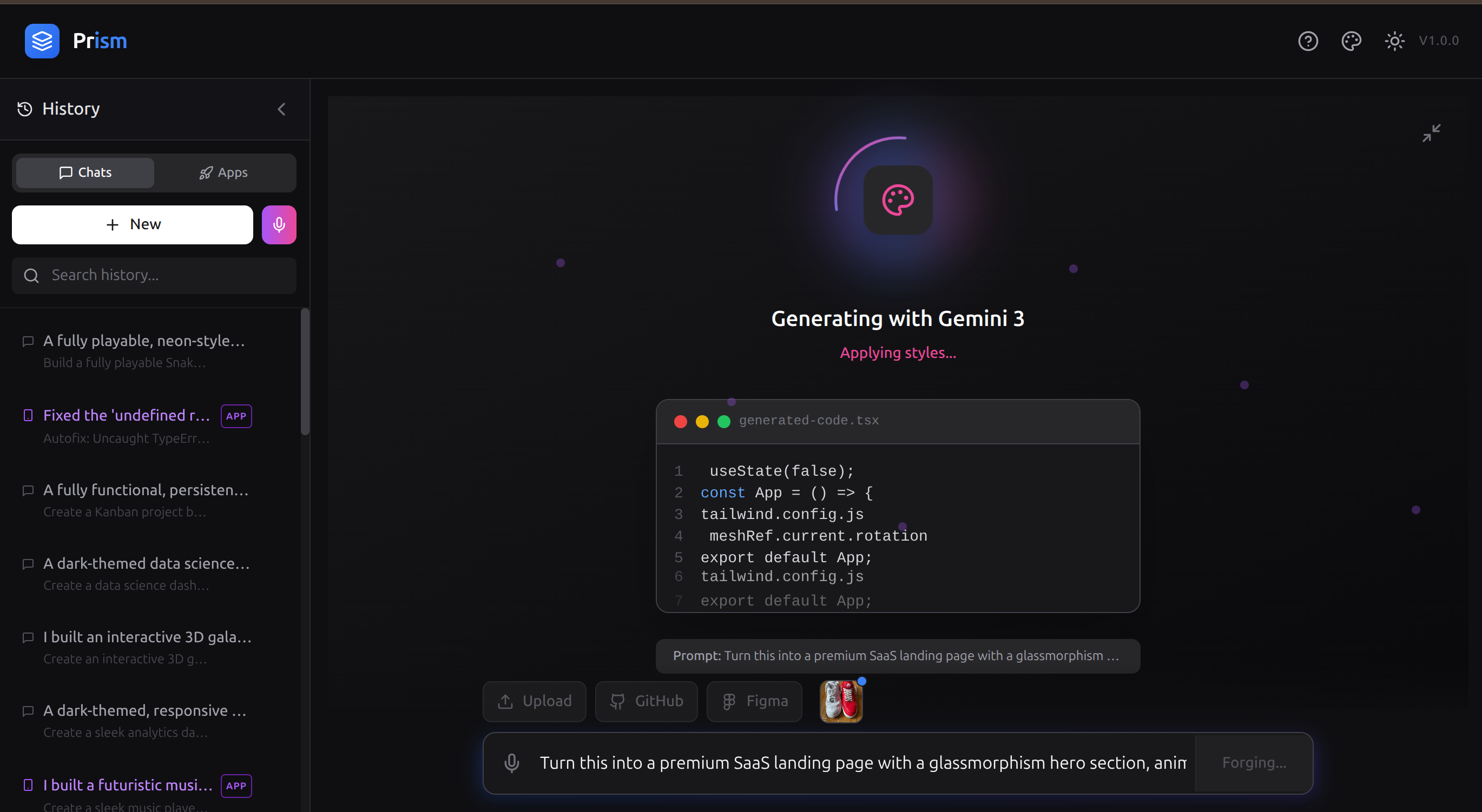 Prism transforms natural language, images, and voice into production-ready code in seconds — powered entirely by Gemini 3.