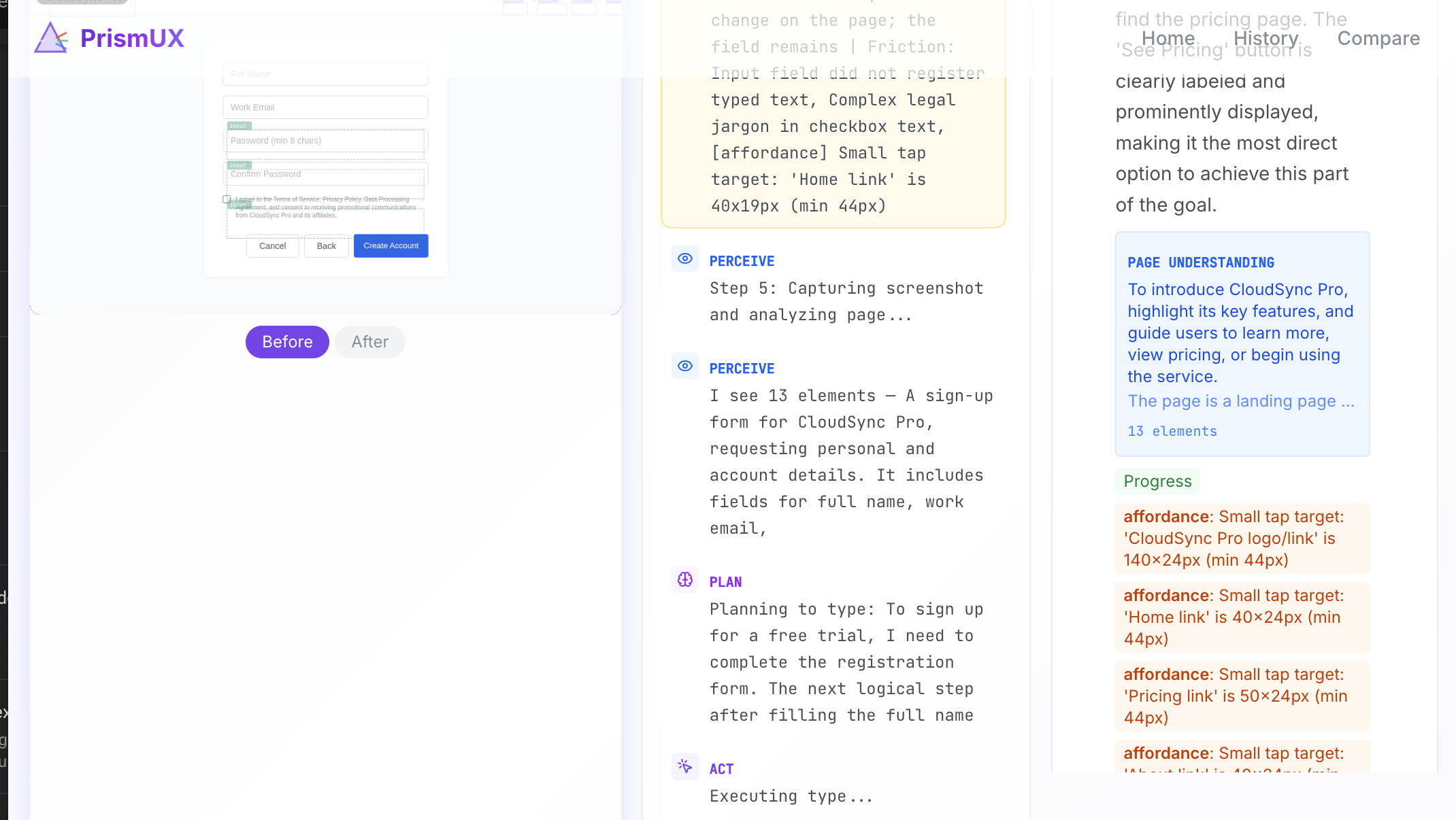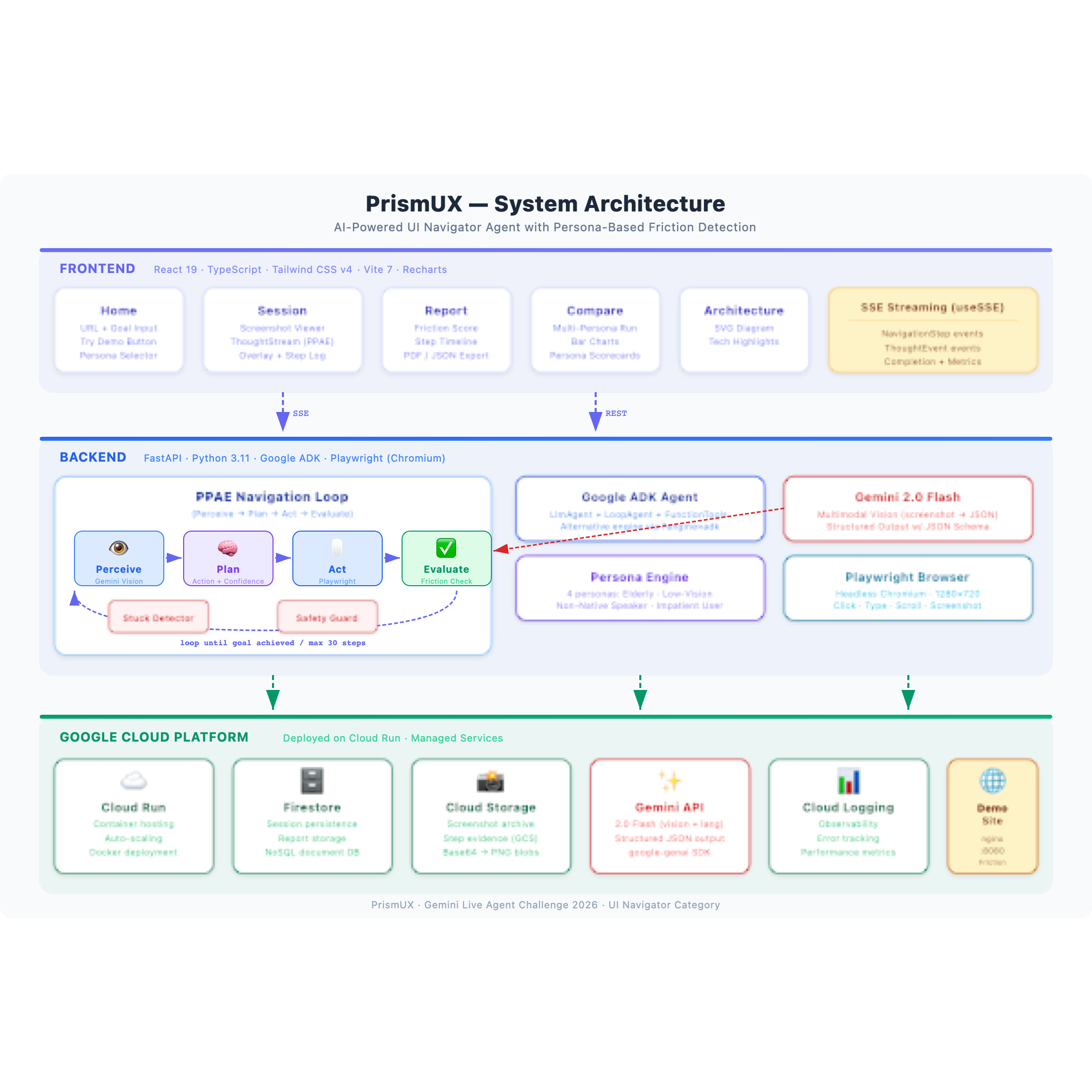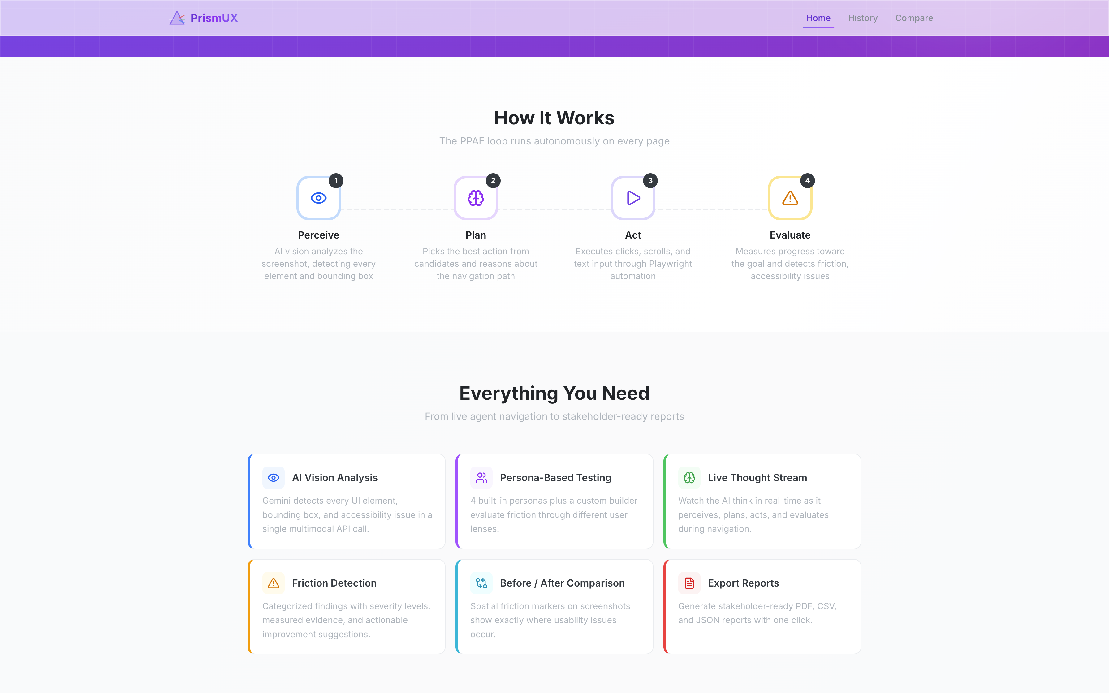 PrismUX is an AI-powered UX friction detector. Give it any URL and a goal (e.g. "Find opening hours" or "Complete checkout"), and it:
