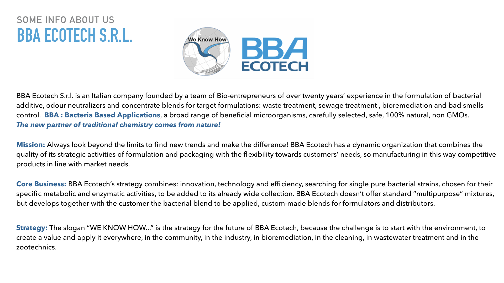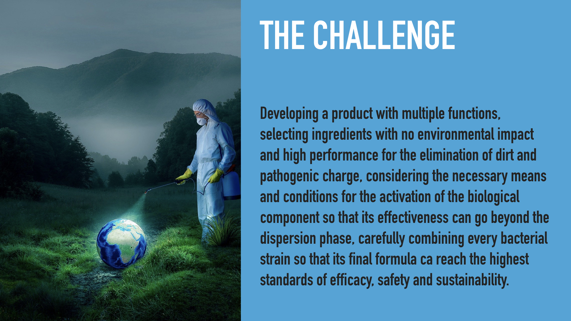Considering the critical issue of Covid-19 and the massive increase in terms of use of disinfectants and chemical cleaners, often environmentally damaging, we aimed at creating a safe, low environmental impact solution, safer for users and highly effective, that will make the difference in the existing cleaning procedures for wide-open external areas and surfaces. We started from our know-how in the formulation of concentrate beneficial bacterial blends, inspired by the multiple technical applications in which microorganism can be efficiently used and, last but not least, from the great skills of bacteria themselves in degrading organic substances.