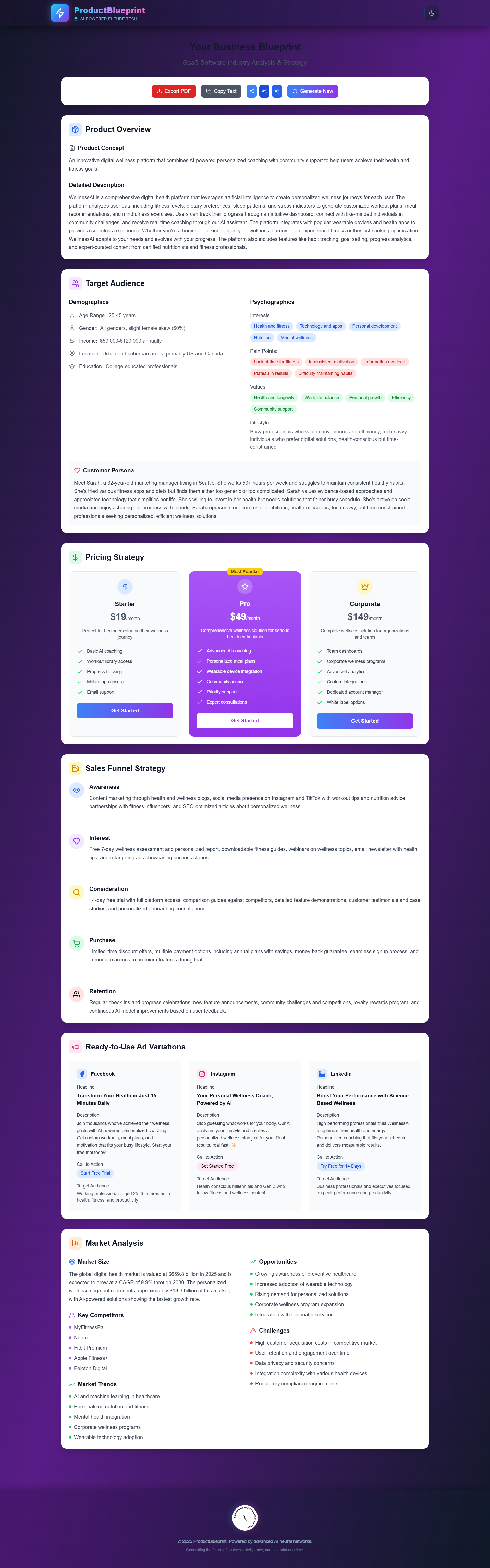 ProductBlueprint generates a full business plan for a digital product based on a niche input. In seconds, it delivers: