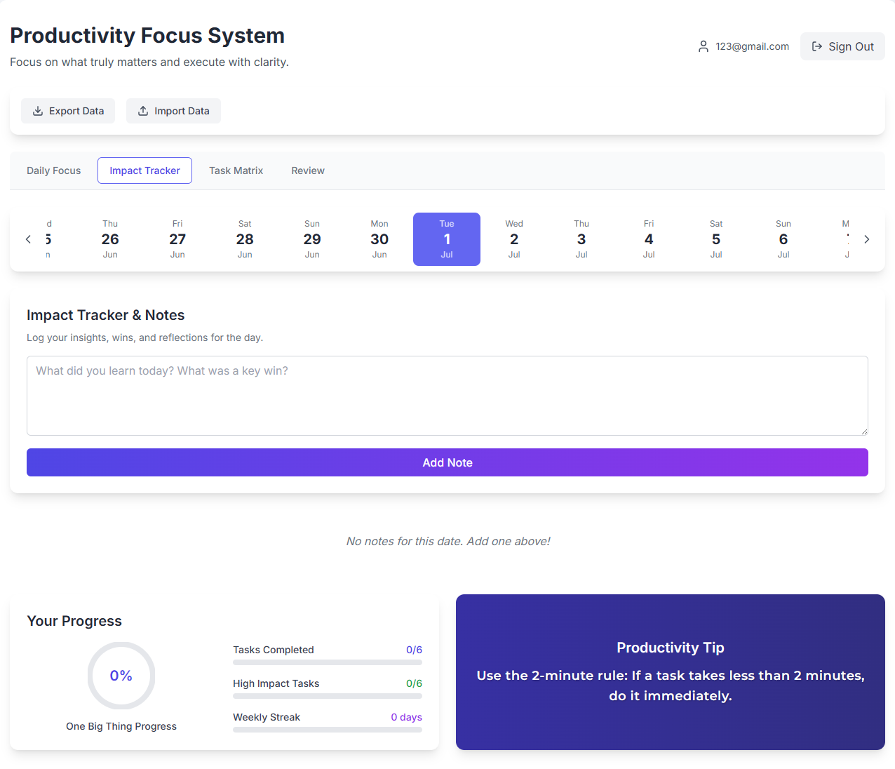 Impact Tracker: A dedicated space to log your daily wins and reflections, building positive momentum and motivation.