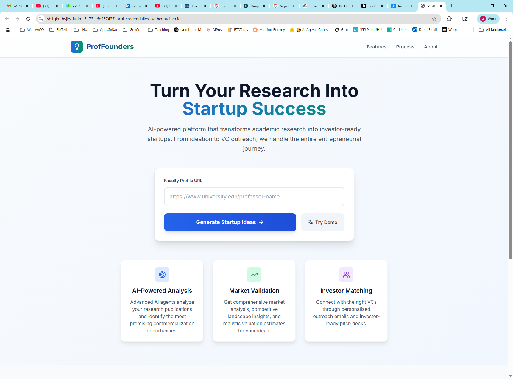 We built ProfFounders entirely on Bolt.new, our no-code/low-code AI-native platform of choice. Bolt allowed us to go from concept to functioning prototype in days—not months—by chaining together AI agents, databases, and front-end experiences without needing to write full-stack code.
